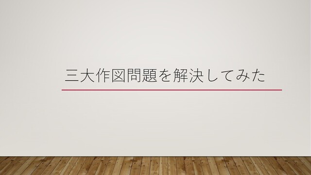 今回の⽬的 注意書き 有名な問題の三⼤作図問題を、解決する 難しい話も所々出るけど、 できるだけ分かりやすく説明していくよ!! 中の⼈がポンコツなのでスライドは簡素だよ