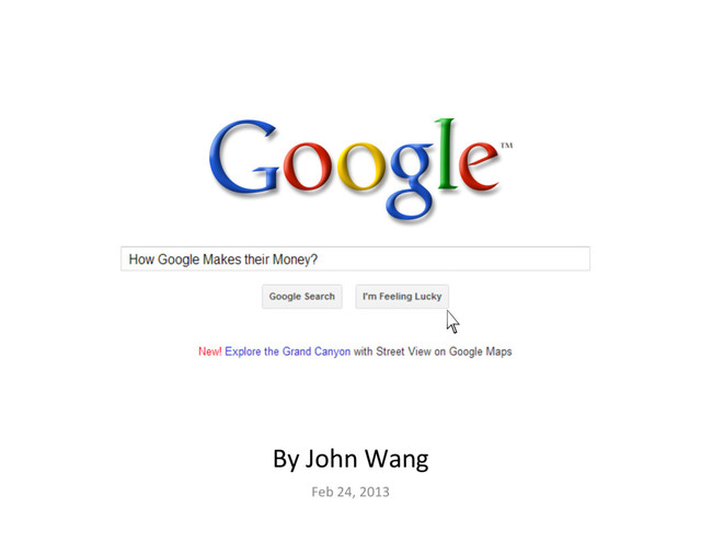 • Google Websites ($31.2b, 62%) – Google.com – Google Finance – Gmail – Blogger – YouTube (est. $3.6b, CiA) Google Websites, $31,221 Network Websites, $12,465 Other, $2,353 Motorola, $4,136 FY 2012, Google Form 10-‐K, 12/31/12 • Network Websites ($12.5b, 25%) – AdSense for Content – AdSense for Search • Other ($2.4b, 5%) – Enterprise products – Display ad management services • Motorola ($4.1b, 8%) $50.2 billion FY 2012 $43.7b, 87% from AdverAsing