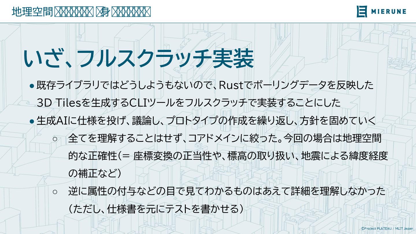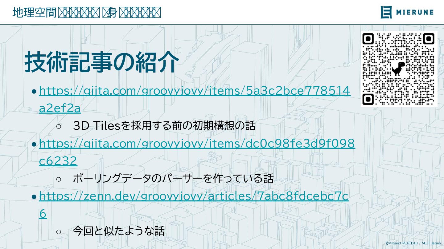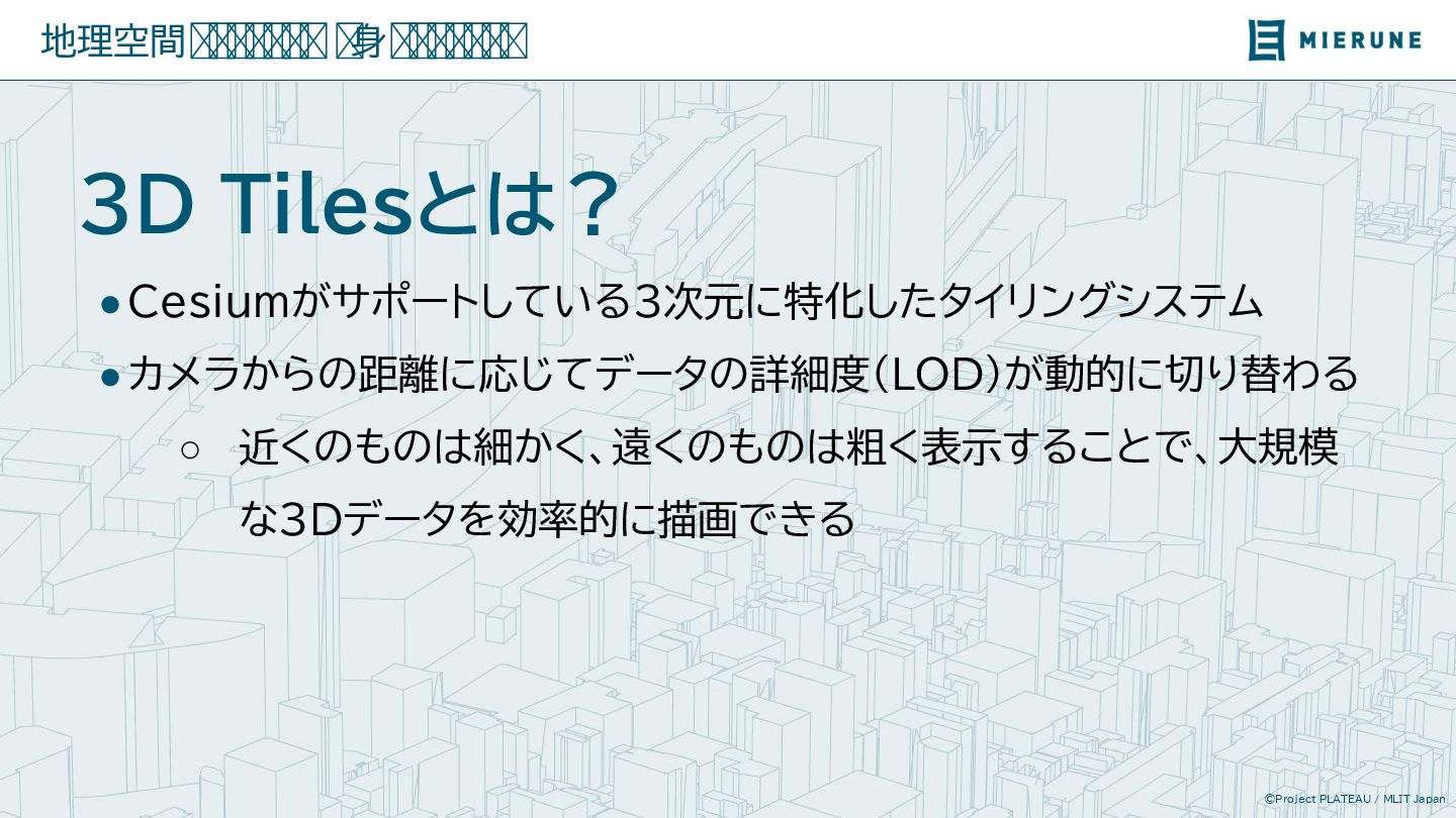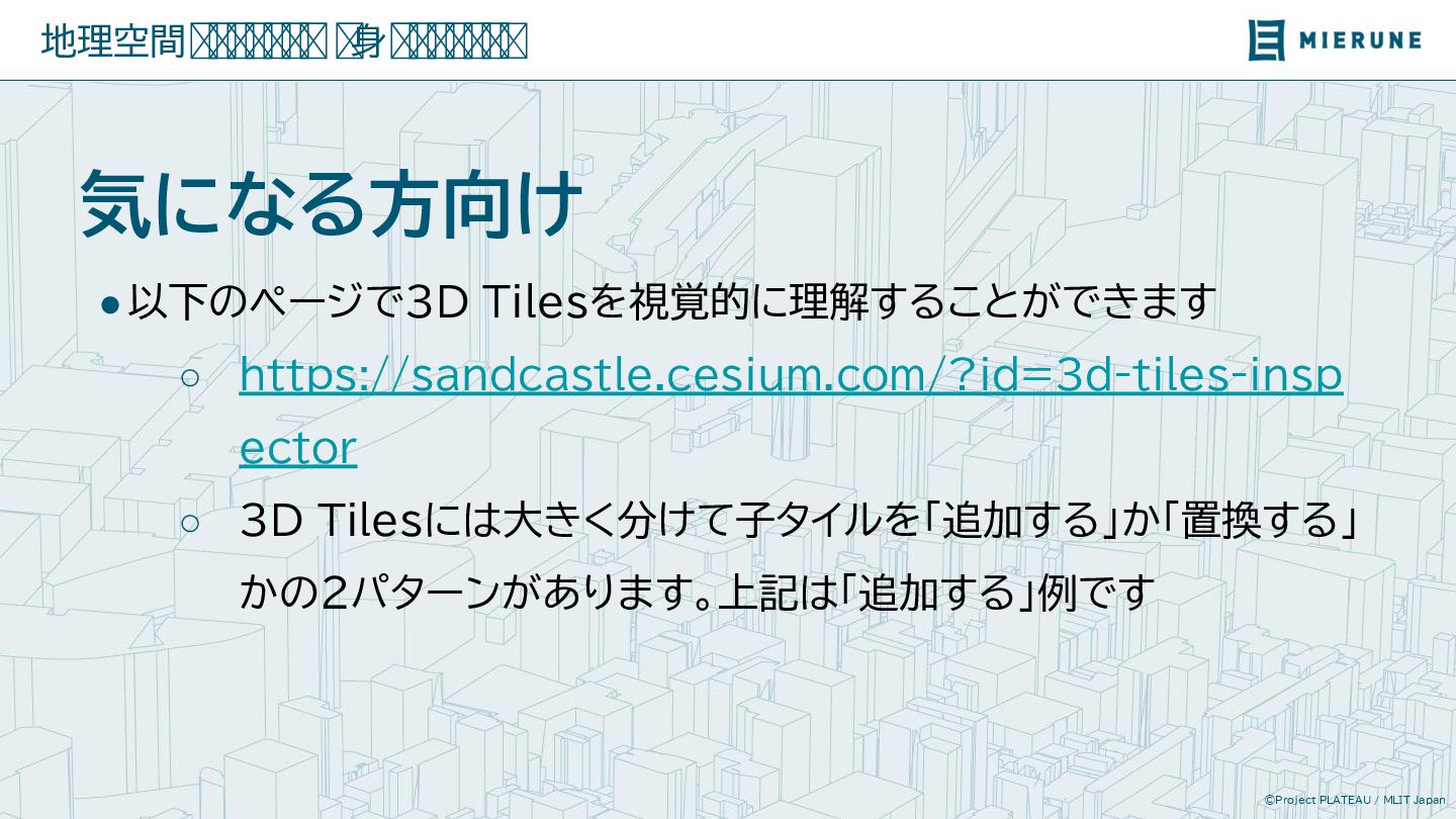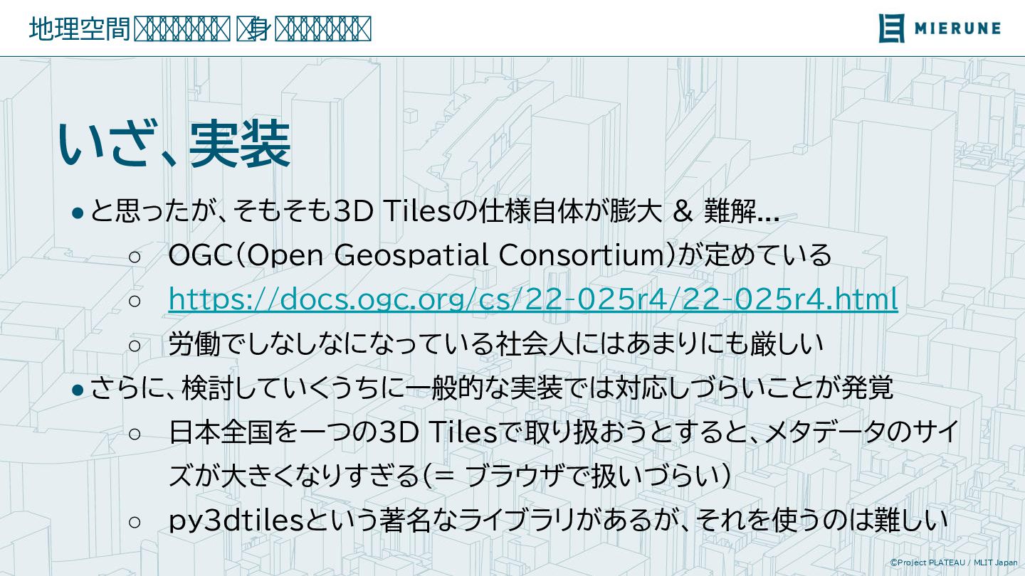 難解... ◦ OGC(Open Geospatial Consortium)が定めている ◦ https://docs.ogc.org/cs/22-025r4/22-025r4.html ◦ 労働でしなしなになっている社会人にはあまりにも厳しい • さらに、検討していくうちに一般的な実装では対応しづらいことが発覚 ◦ 日本全国を一つの3D Tilesで取り扱おうとすると、メタデータのサイ ズが大きくなりすぎる(= ブラウザで扱いづらい) ◦ py3dtilesという著名なライブラリがあるが、それを使うのは難しい いざ、実装