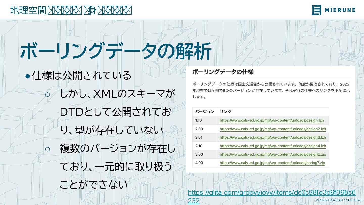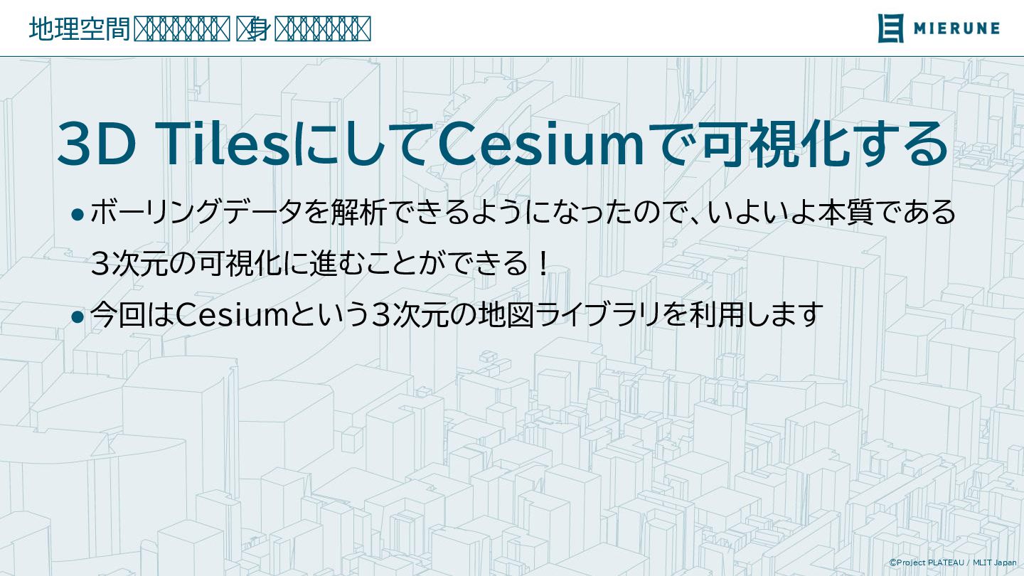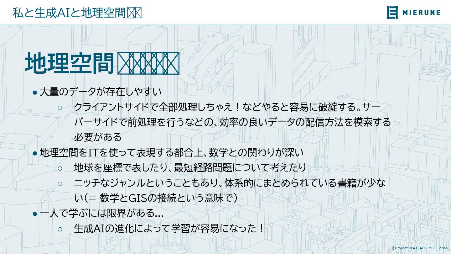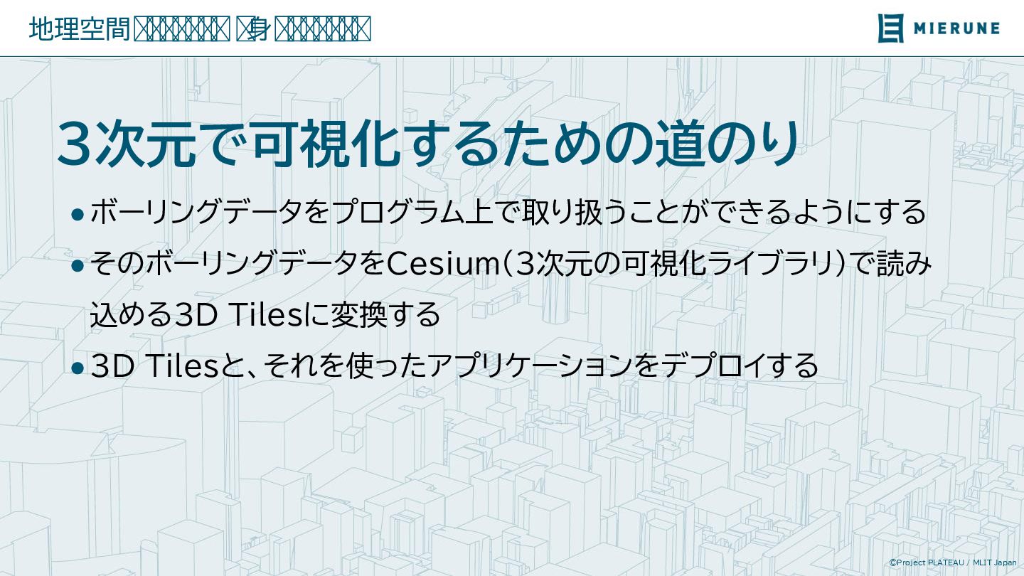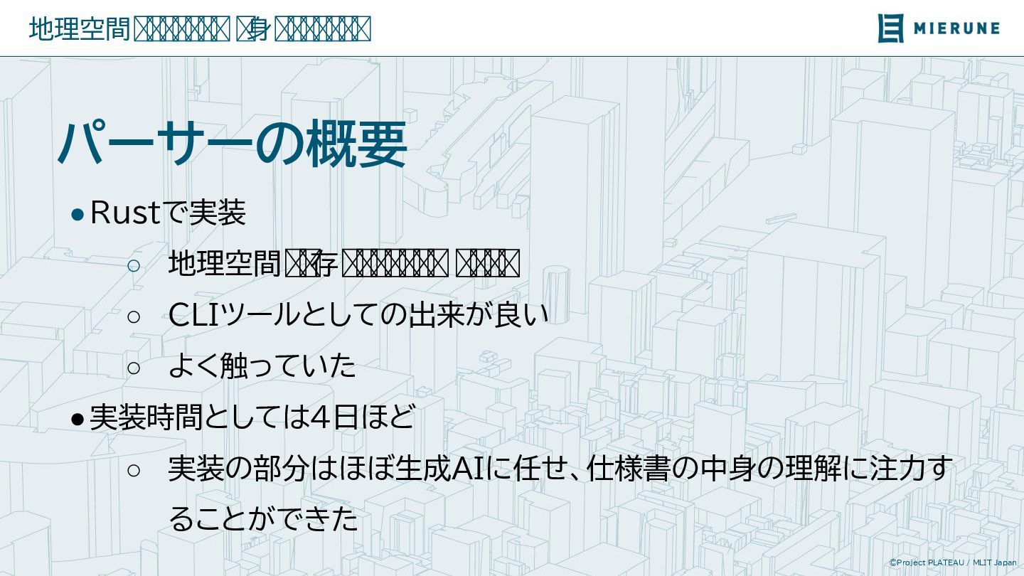 難解... ◦ OGC(Open Geospatial Consortium)が定めている ◦ https://docs.ogc.org/cs/22-025r4/22-025r4.html ◦ 労働でしなしなになっている社会人にはあまりにも厳しい • さらに、検討していくうちに一般的な実装では対応しづらいことが発覚 ◦ 日本全国を一つの3D Tilesで取り扱おうとすると、メタデータのサイ ズが大きくなりすぎる(= ブラウザで扱いづらい) ◦ py3dtilesという著名なライブラリがあるが、それを使うのは難しい いざ、実装