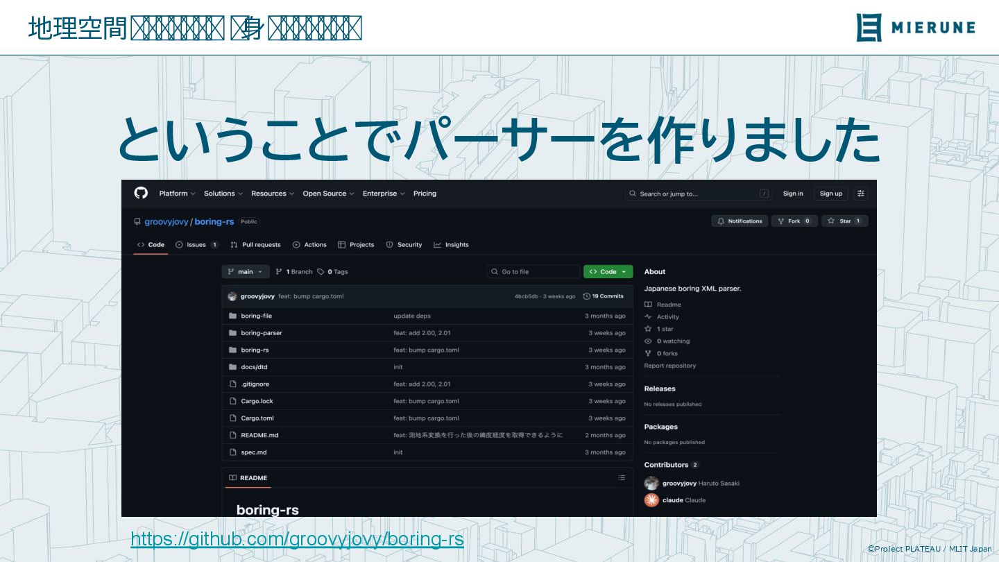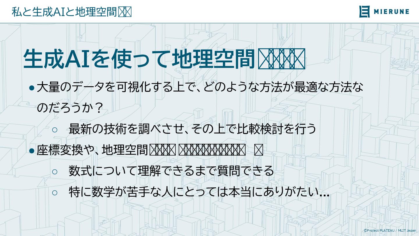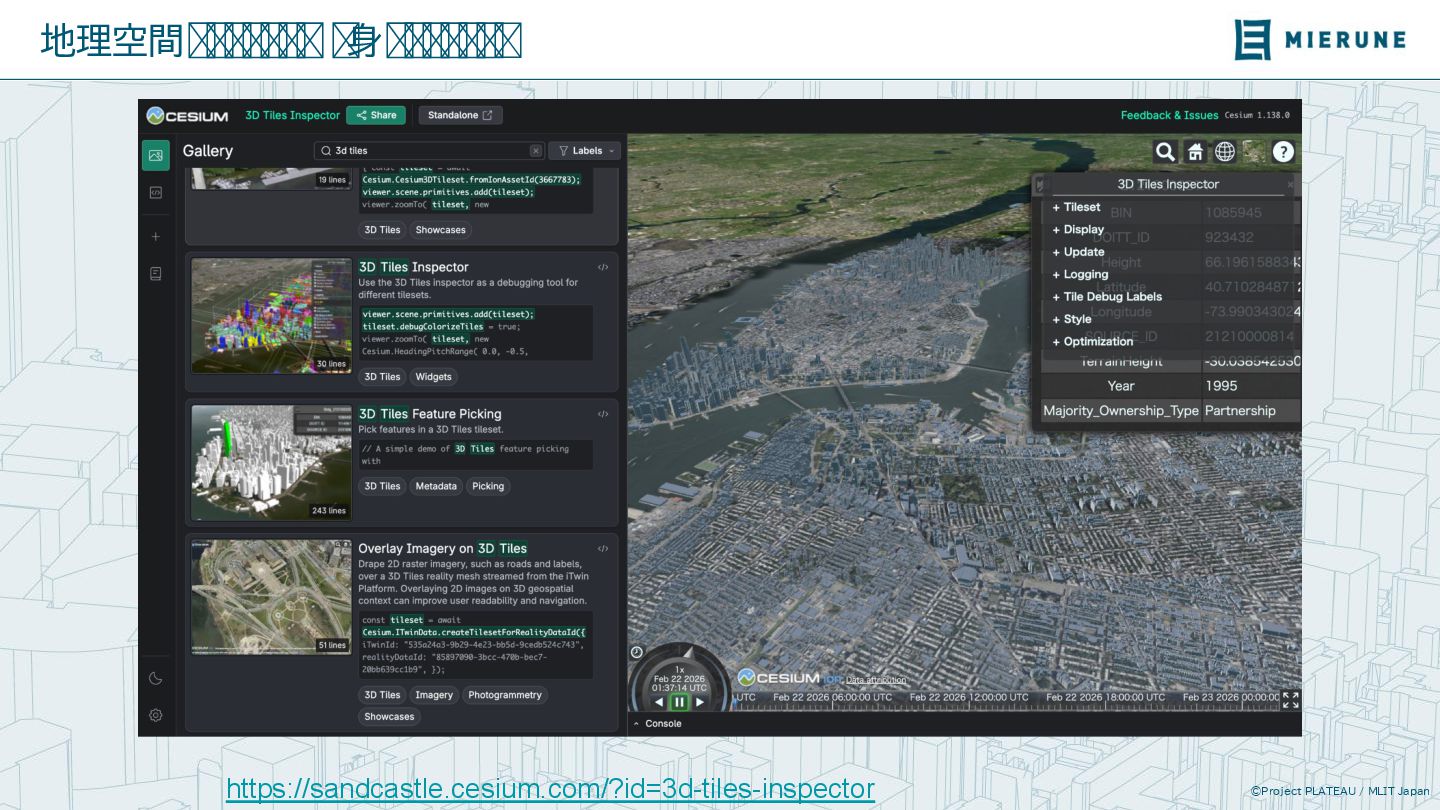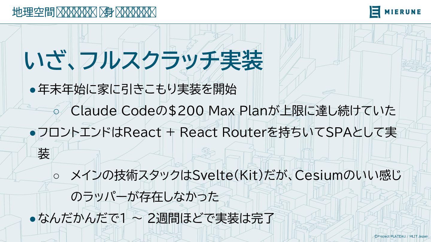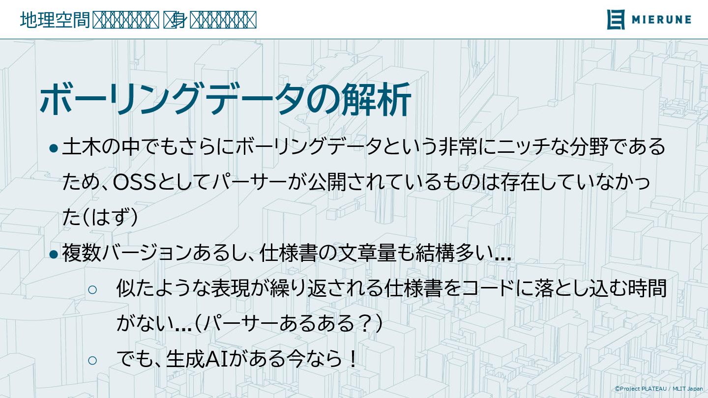 難解... ◦ OGC(Open Geospatial Consortium)が定めている ◦ https://docs.ogc.org/cs/22-025r4/22-025r4.html ◦ 労働でしなしなになっている社会人にはあまりにも厳しい • さらに、検討していくうちに一般的な実装では対応しづらいことが発覚 ◦ 日本全国を一つの3D Tilesで取り扱おうとすると、メタデータのサイ ズが大きくなりすぎる(= ブラウザで扱いづらい) ◦ py3dtilesという著名なライブラリがあるが、それを使うのは難しい いざ、実装
