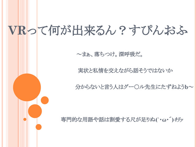 VRって何が出来るん?すぴんおふ ~まぁ、落ちつけ。深呼吸だ。 実状と私情を交えながら話そうではないか 分からないと言う人はグー◦ル先生にたずねようb~ 専門的な用語や話は割愛する尺が足りぬ(`・ω・´)キリッ