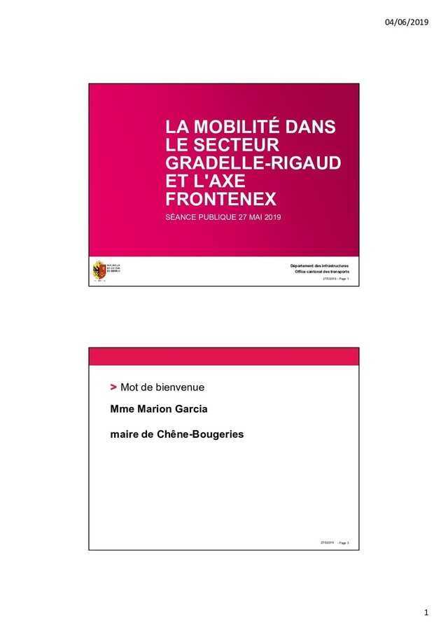 Office cantonal des transports Département des infrastructures LA MOBILITÉ DANS LE SECTEUR GRADELLE-RIGAUD ET L'AXE FRONTENEX SÉANCE PUBLIQUE 27 MAI 2019 04/06/2019 - Page 3 > Mot de bienvenue Mme Marion Garcia maire de Chêne-Bougeries 27/5/2019