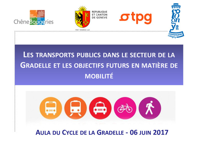 BEDETTI, CONSEILLÈRE ADMINISTRATIVE EN CHARGE DE LA MOBILITÉ POUR LA COMMUNE DE CHÊNE-BOUGERIES. 2. INTERVENTIONS DE : M. Gérard Widmer, directeur régional Arve-Lac, Direction générale des transports (DGT). Mme Marion Guillot, ingénieure planification, Direction des transports collectifs - DGT. M. Sébastien Weibel, responsable du Pôle «Réseaux Exploitation» - TPG. M. Alexandre Genton, ingénieur transports auprès du Développement du réseau Arve- Lac - TPG. 3. VOS QUESTIONS. 4. POURSUITE DES ÉCHANGES AUTOUR D’UNE VERRÉE.