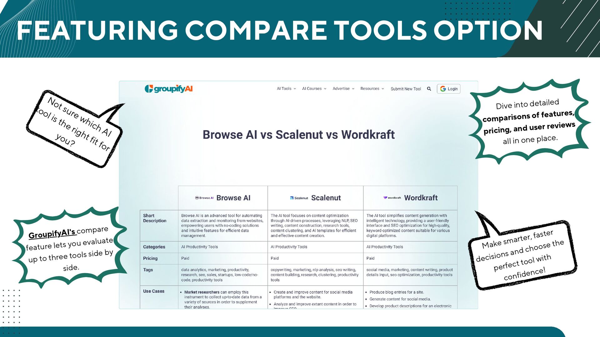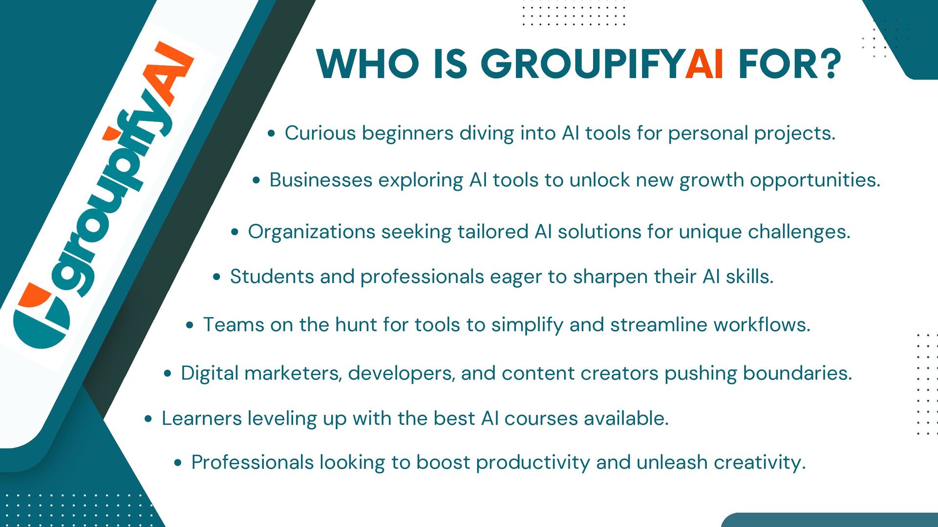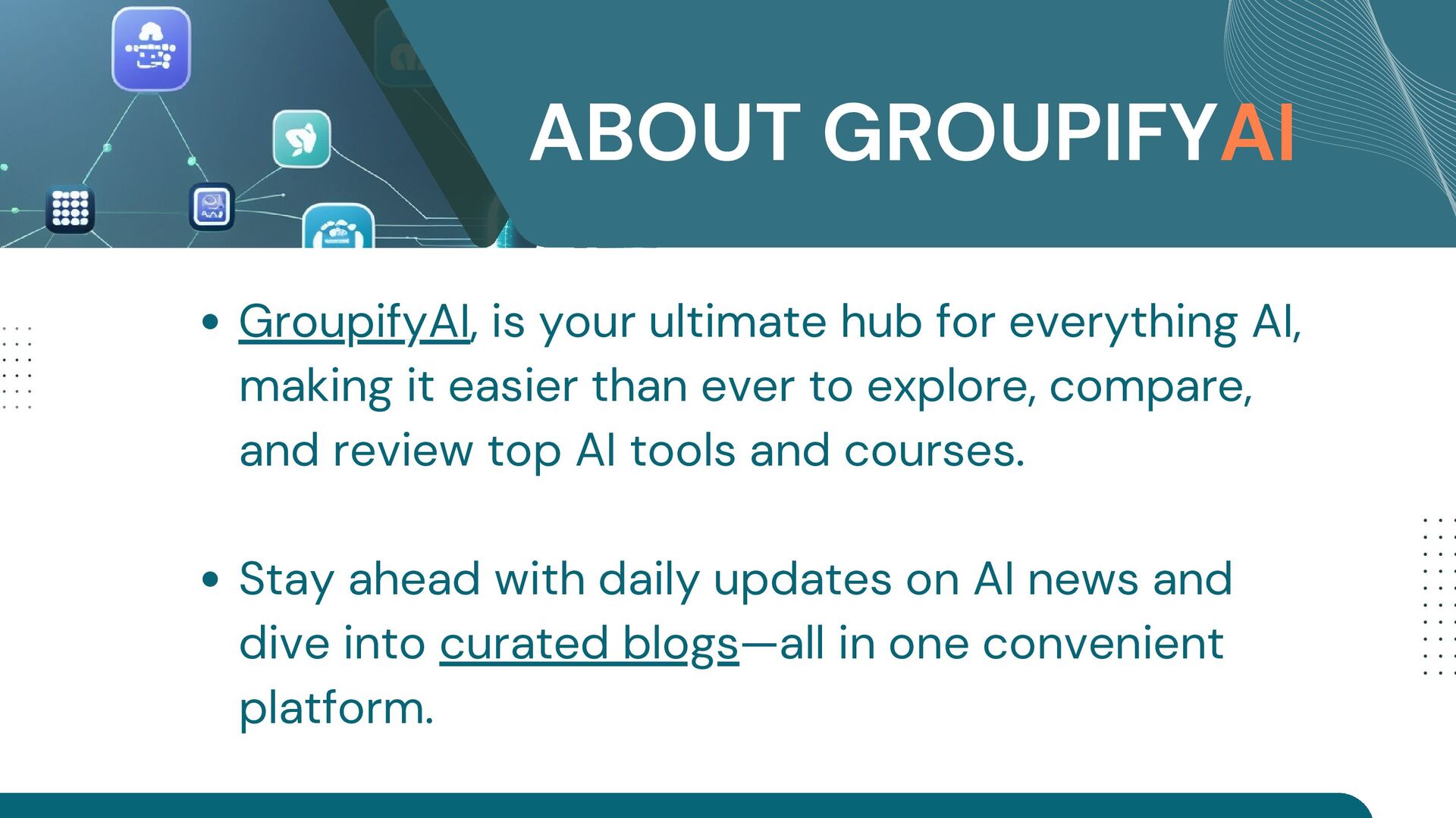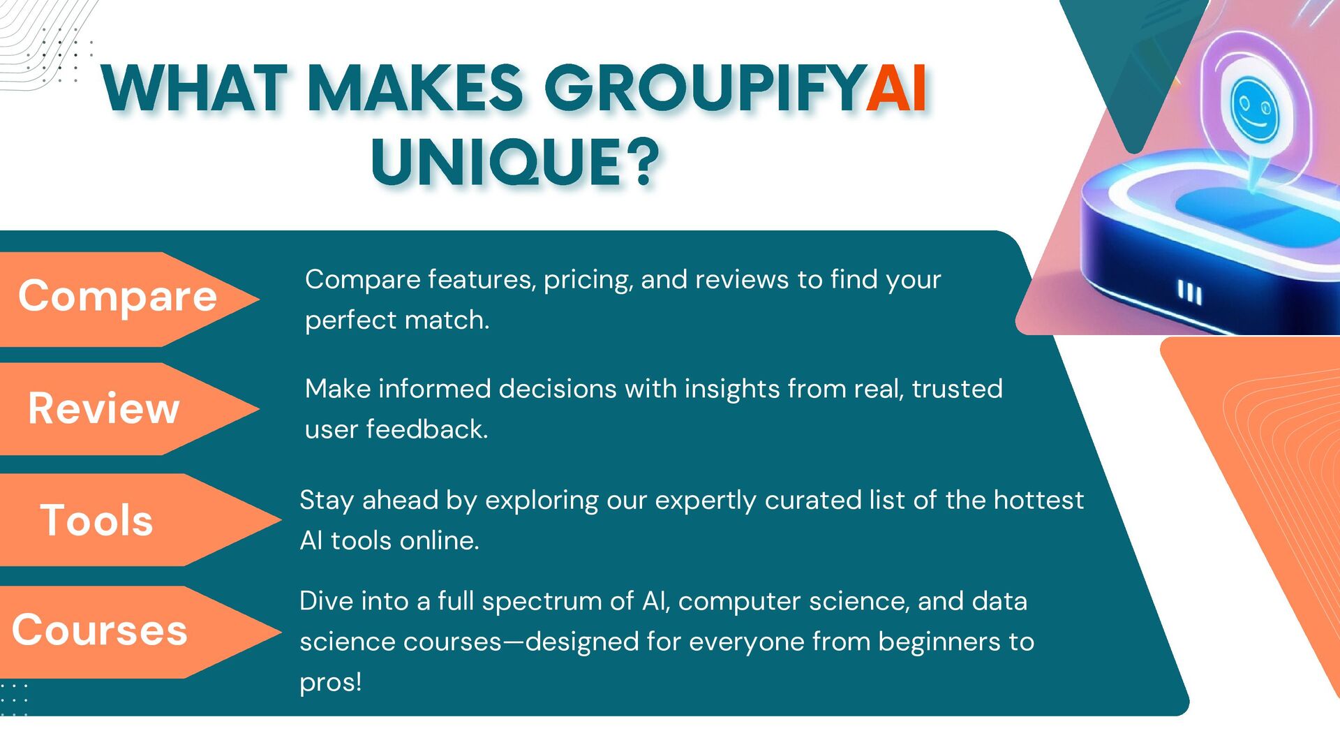 GroupifyAI is your go-to platform for discovering, comparing, and reviewing the best AI tools and courses, all in one place. Whether you're a beginner taking your first steps into AI or an experienced pro seeking the latest innovations, we make it easy to find exactly what you need. Our powerful comparison feature lets you evaluate AI tools side by side, checking features, pricing, and user reviews to make smarter decisions. From AI productivity tools that streamline workflows to AI generators for text, images, and videos, we bring you the most cutting-edge solutions. Looking to upskill? Explore top AI courses in machine learning, data science, and automation, tailored for all levels. Stay ahead with expert-curated content, daily AI news, and insightful blogs, ensuring you never miss an important update. Whether you're exploring, learning, or optimizing your workflow, GroupifyAI makes navigating the world of AI effortless and exciting!