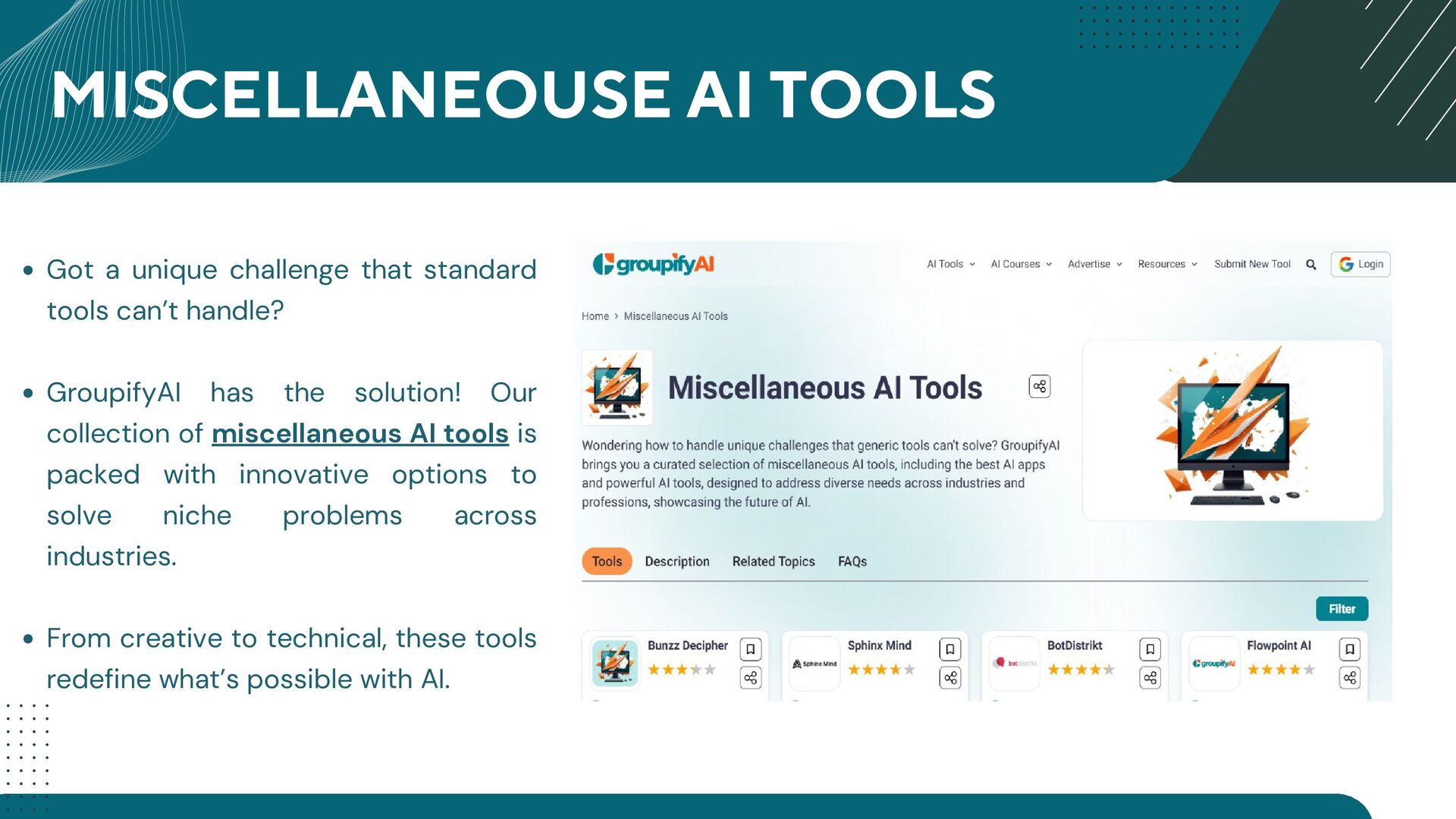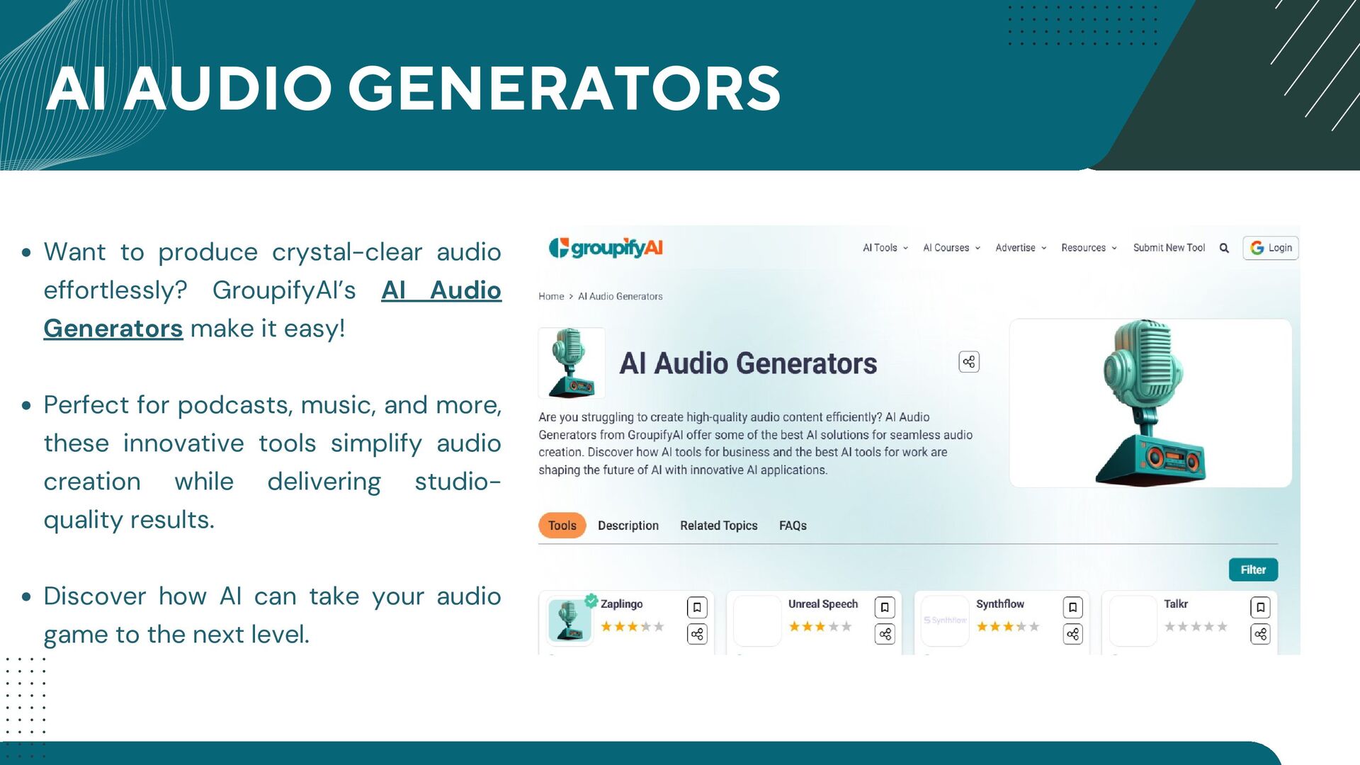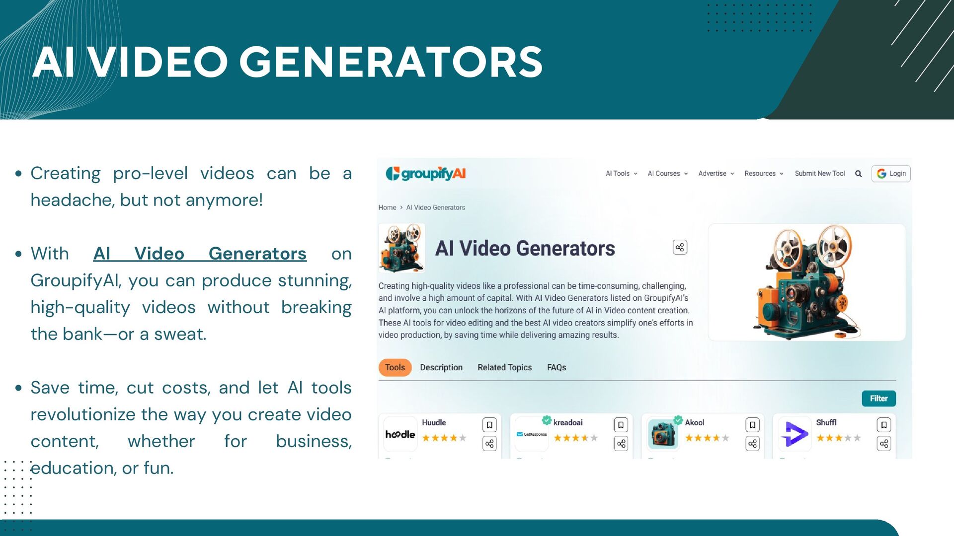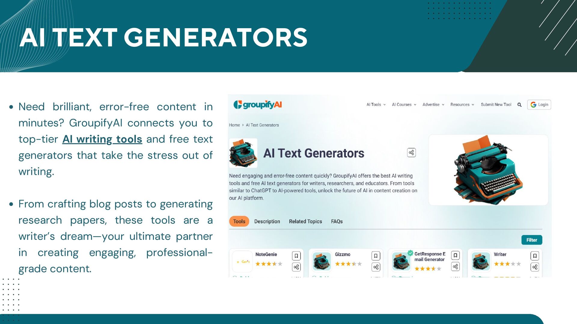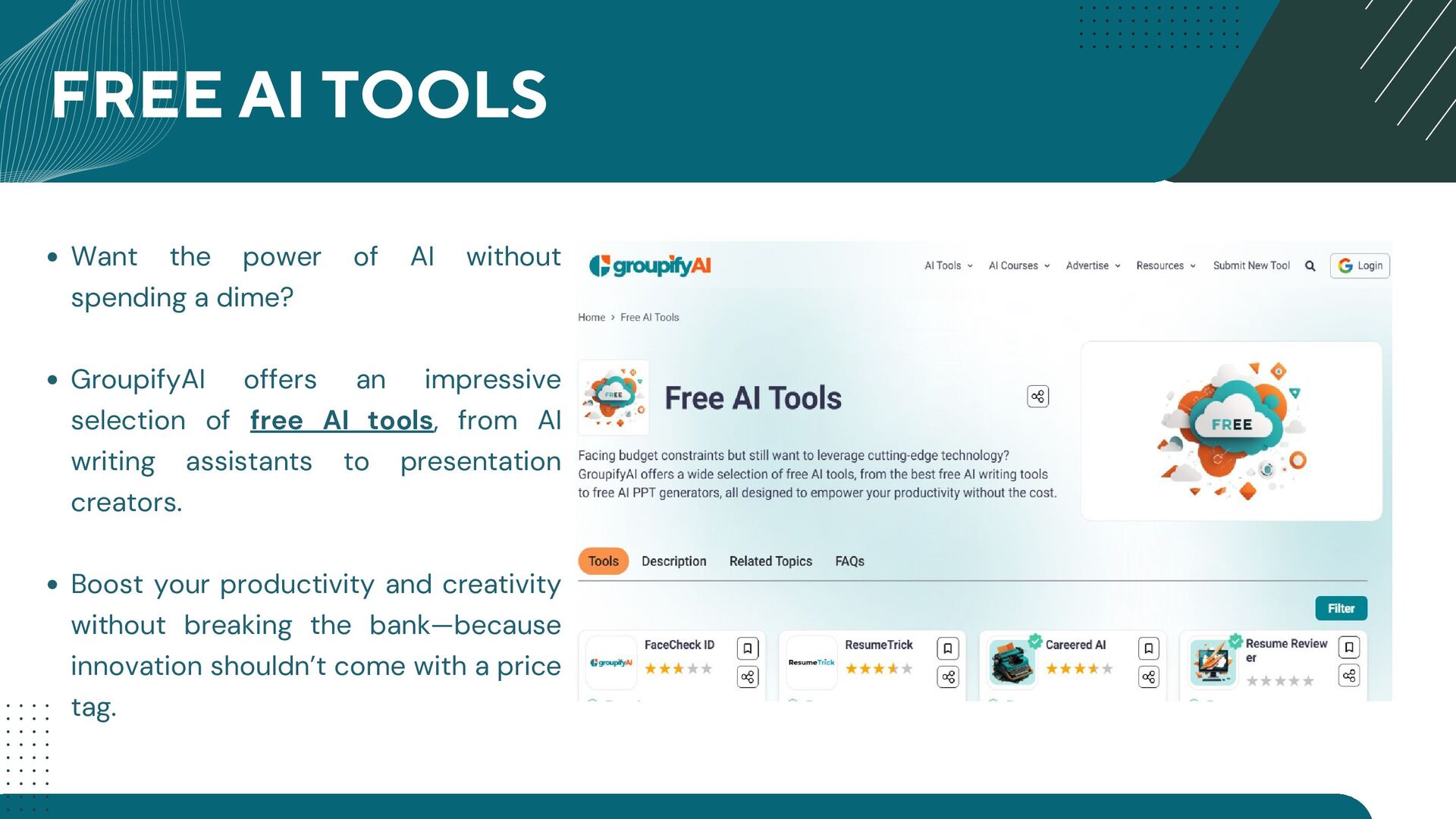GroupifyAI is your go-to platform for discovering, comparing, and reviewing the best AI tools and courses, all in one place. Whether you're a beginner taking your first steps into AI or an experienced pro seeking the latest innovations, we make it easy to find exactly what you need. Our powerful comparison feature lets you evaluate AI tools side by side, checking features, pricing, and user reviews to make smarter decisions. From AI productivity tools that streamline workflows to AI generators for text, images, and videos, we bring you the most cutting-edge solutions. Looking to upskill? Explore top AI courses in machine learning, data science, and automation, tailored for all levels. Stay ahead with expert-curated content, daily AI news, and insightful blogs, ensuring you never miss an important update. Whether you're exploring, learning, or optimizing your workflow, GroupifyAI makes navigating the world of AI effortless and exciting!