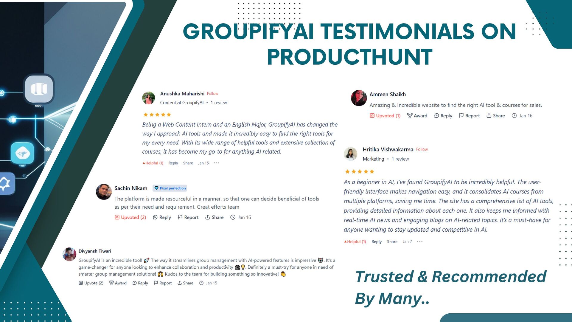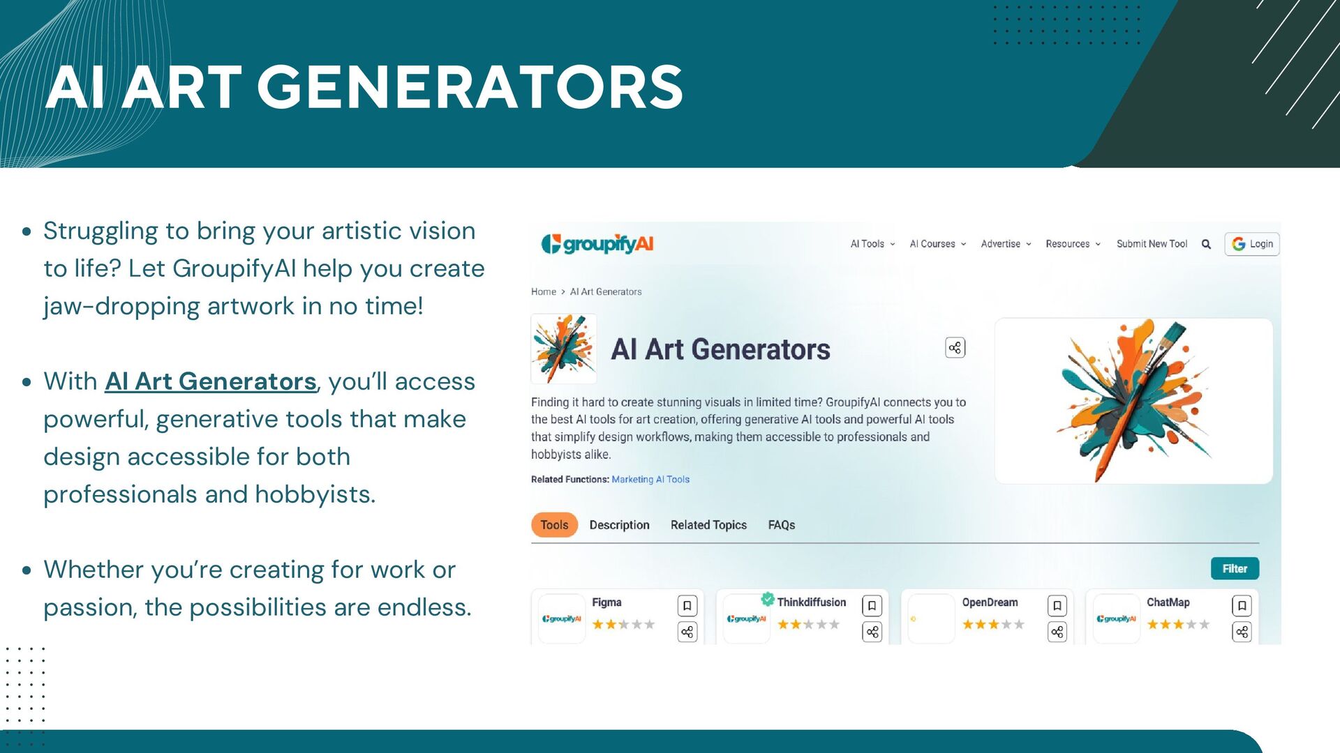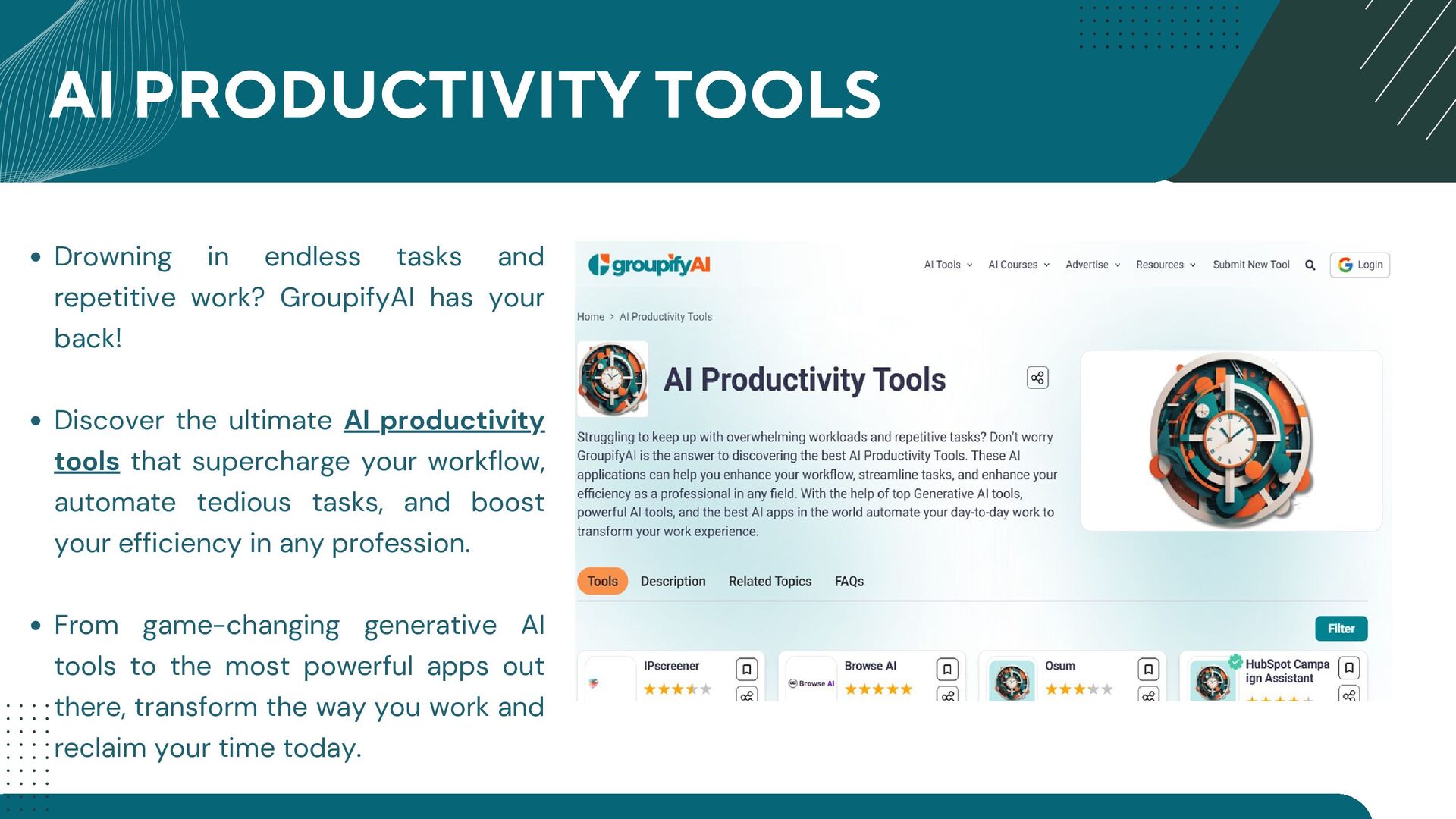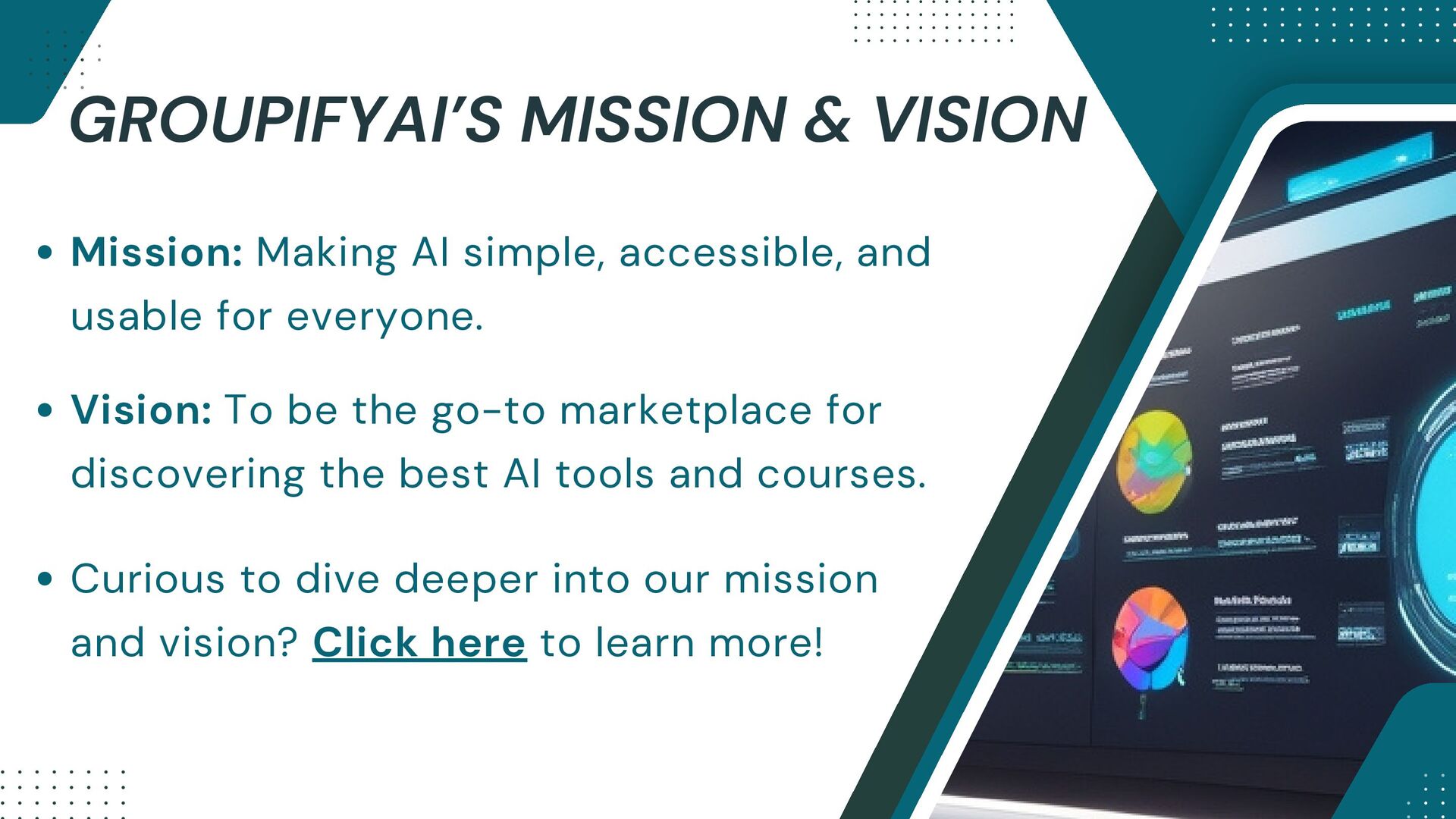 GroupifyAI is your go-to platform for discovering, comparing, and reviewing the best AI tools and courses, all in one place. Whether you're a beginner taking your first steps into AI or an experienced pro seeking the latest innovations, we make it easy to find exactly what you need. Our powerful comparison feature lets you evaluate AI tools side by side, checking features, pricing, and user reviews to make smarter decisions. From AI productivity tools that streamline workflows to AI generators for text, images, and videos, we bring you the most cutting-edge solutions. Looking to upskill? Explore top AI courses in machine learning, data science, and automation, tailored for all levels. Stay ahead with expert-curated content, daily AI news, and insightful blogs, ensuring you never miss an important update. Whether you're exploring, learning, or optimizing your workflow, GroupifyAI makes navigating the world of AI effortless and exciting!
