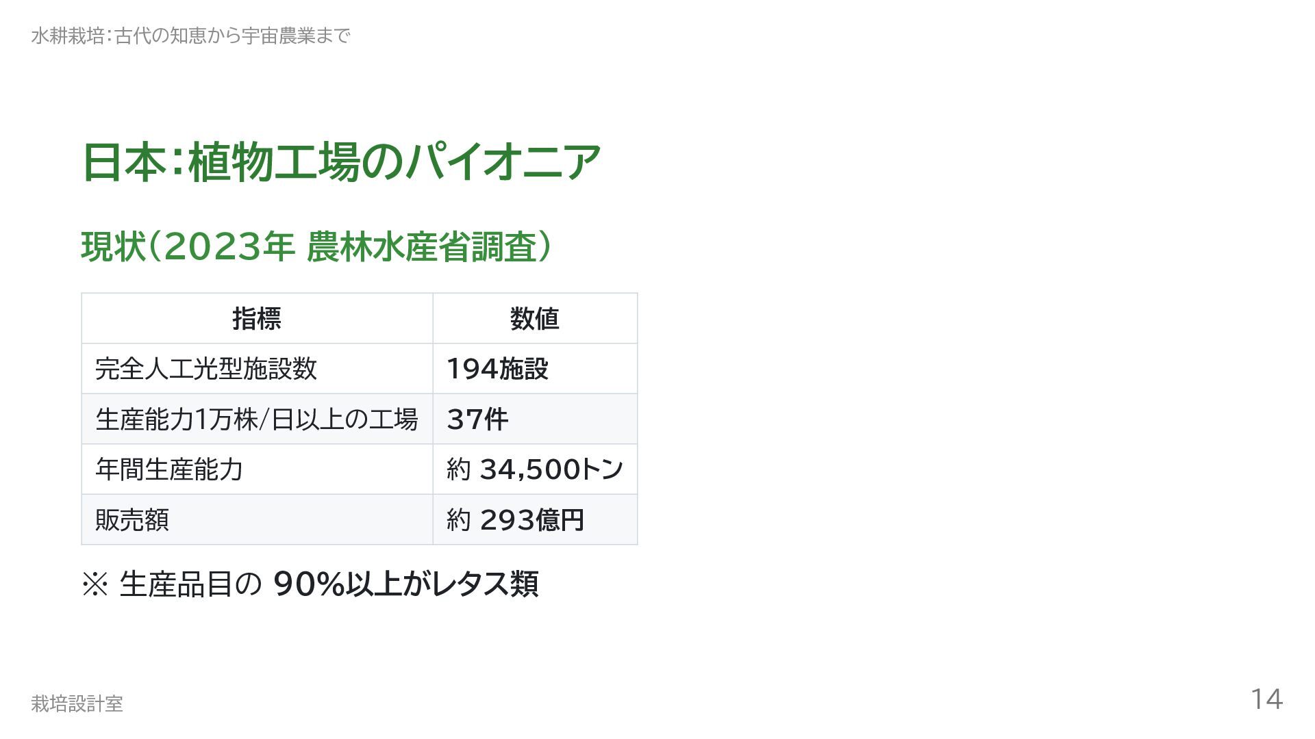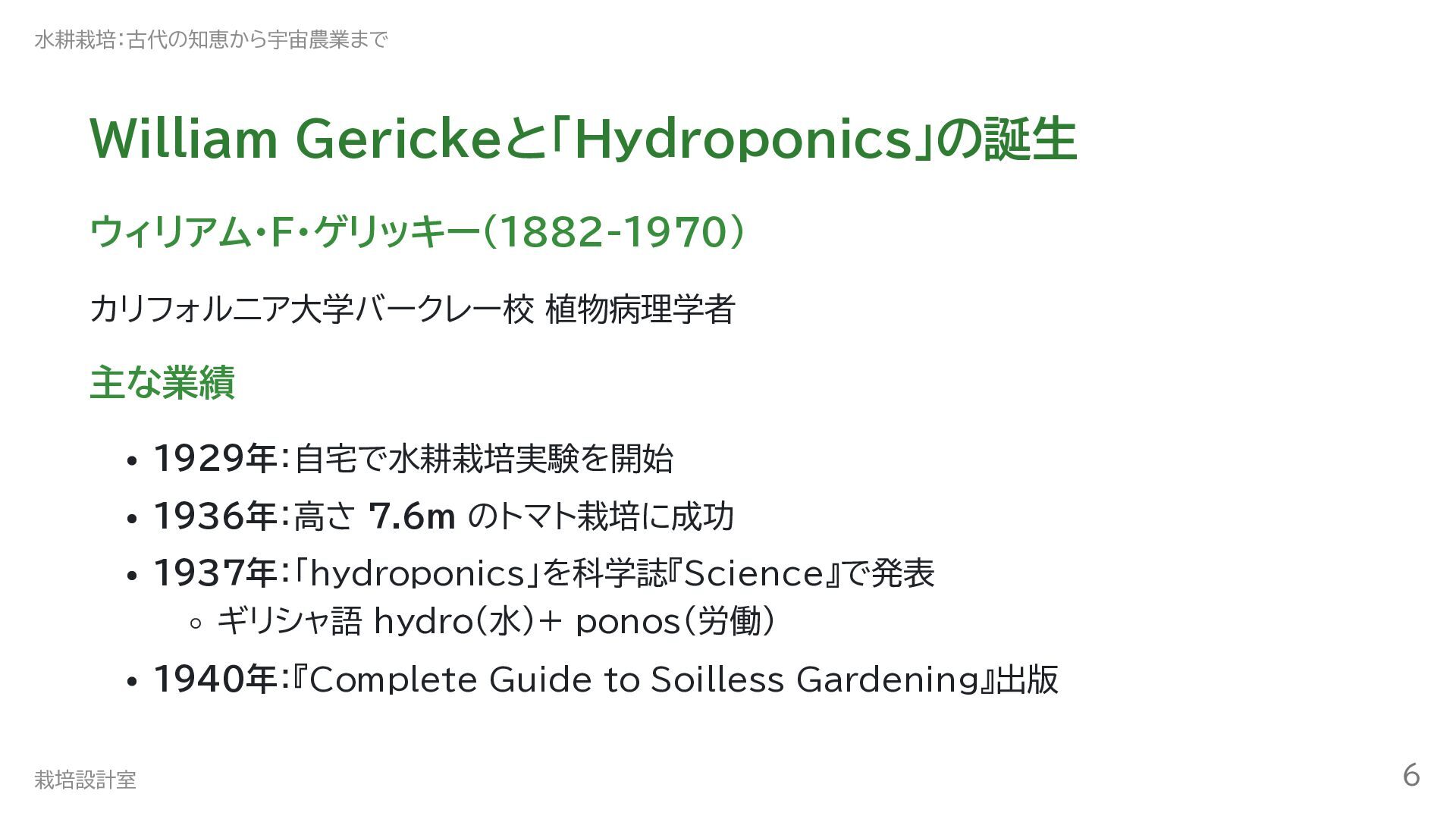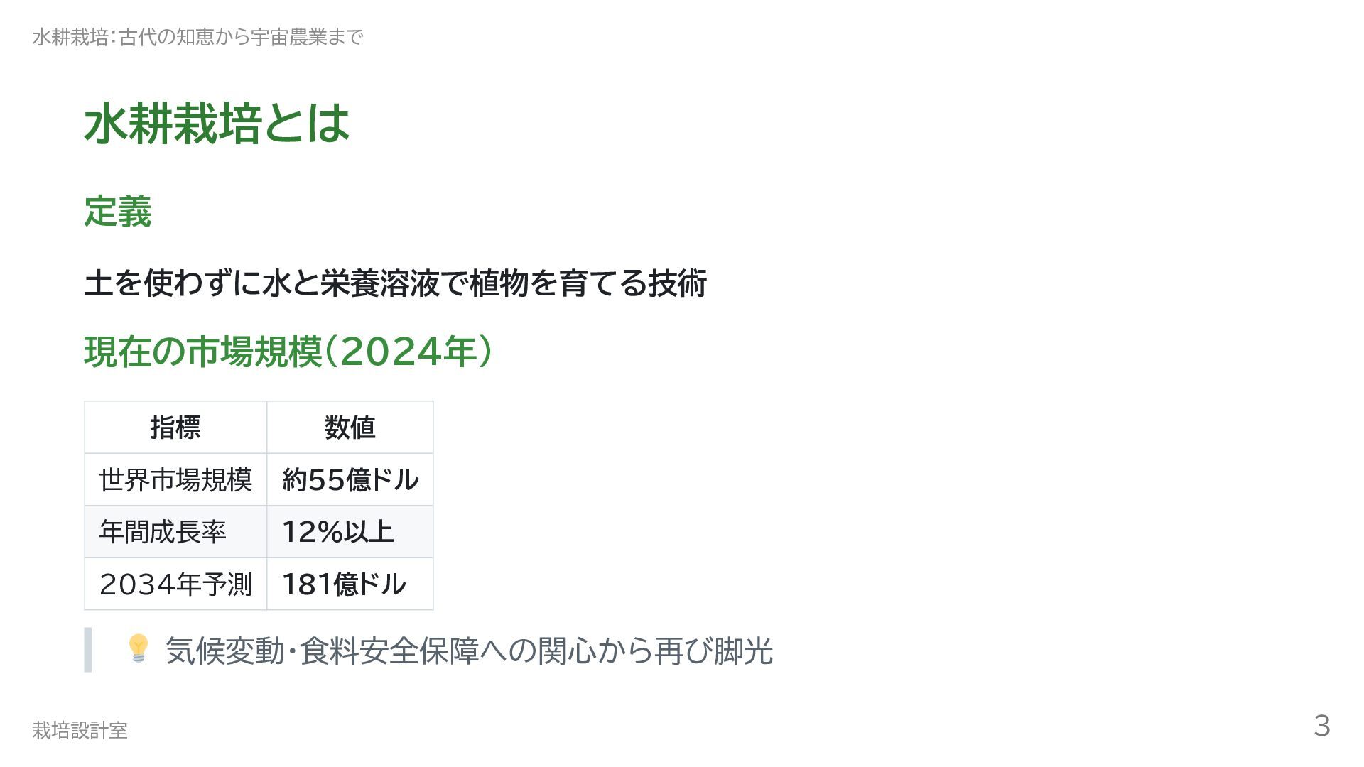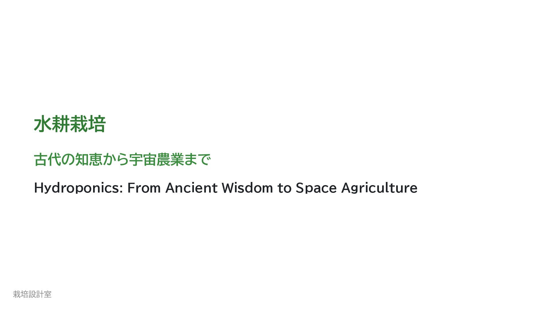 400年以上の科学的蓄積を持つ水耕栽培の全体像を、歴史・技術・ビジネスの3つの視点から概観するスライドです。