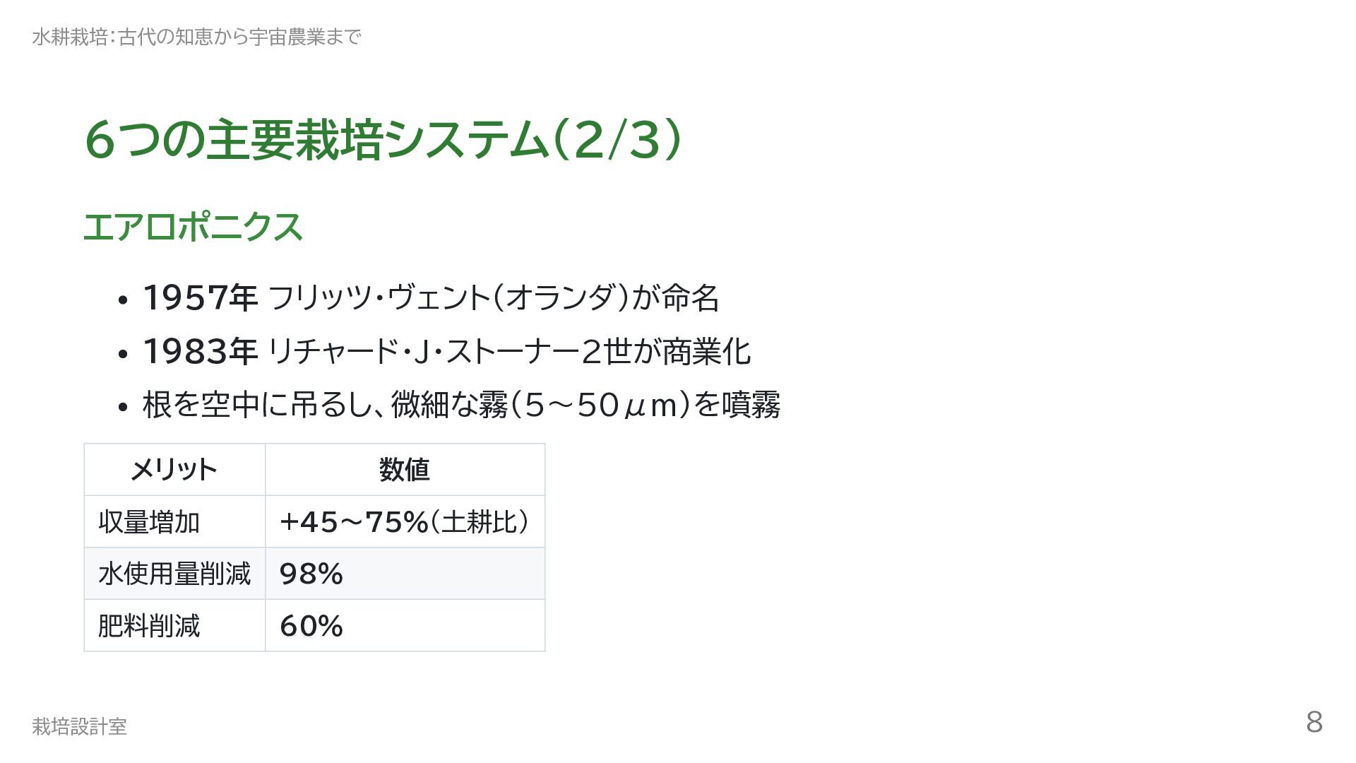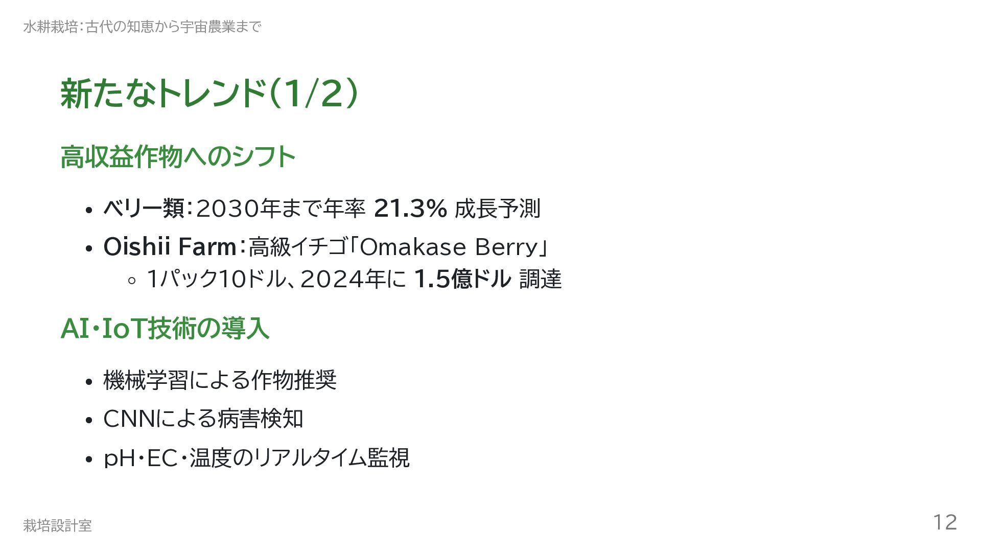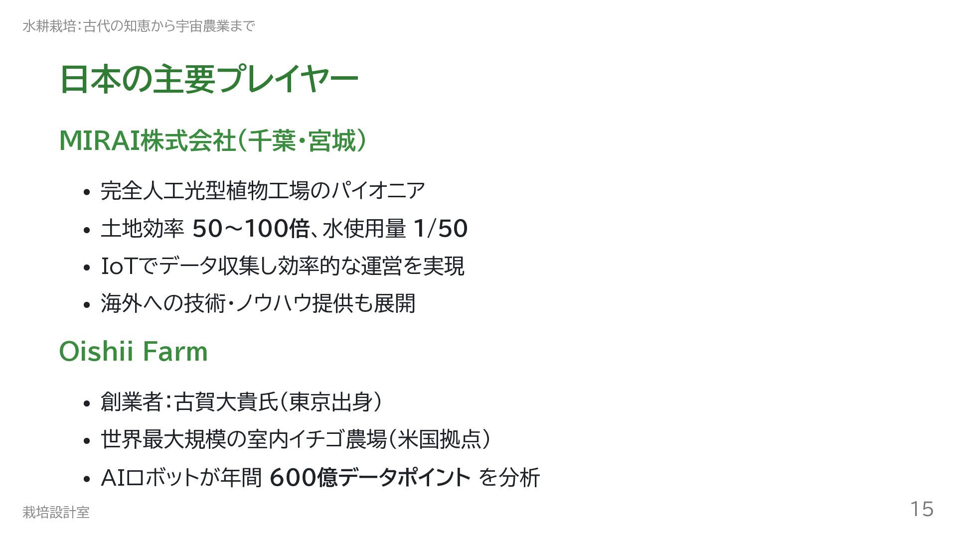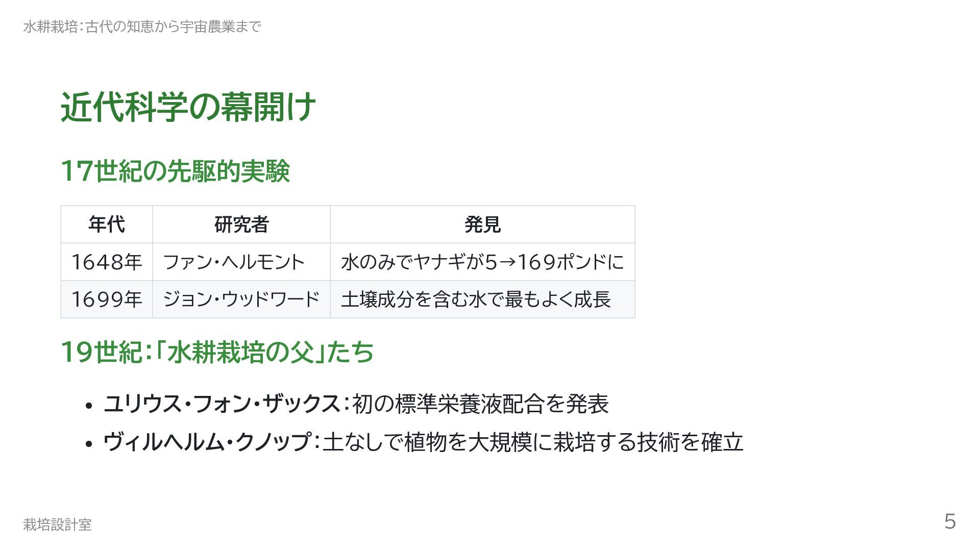 400年以上の科学的蓄積を持つ水耕栽培の全体像を、歴史・技術・ビジネスの3つの視点から概観するスライドです。