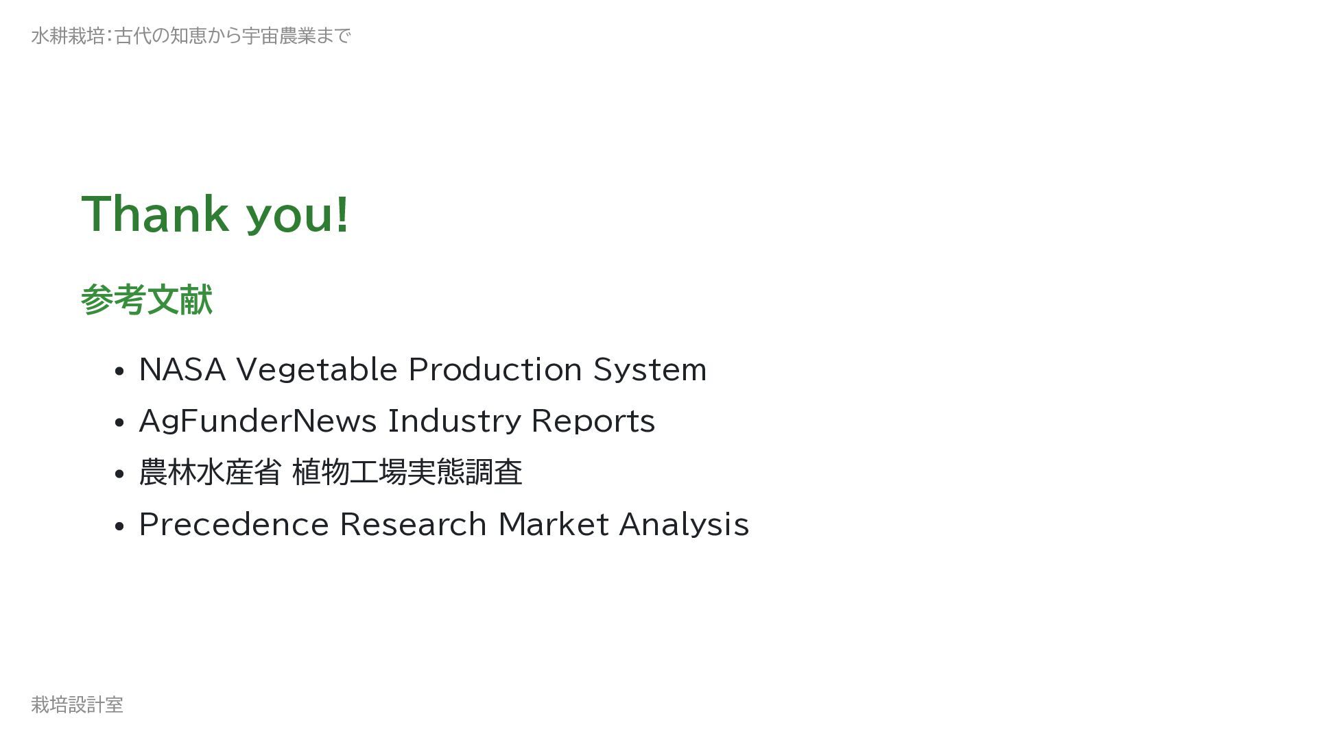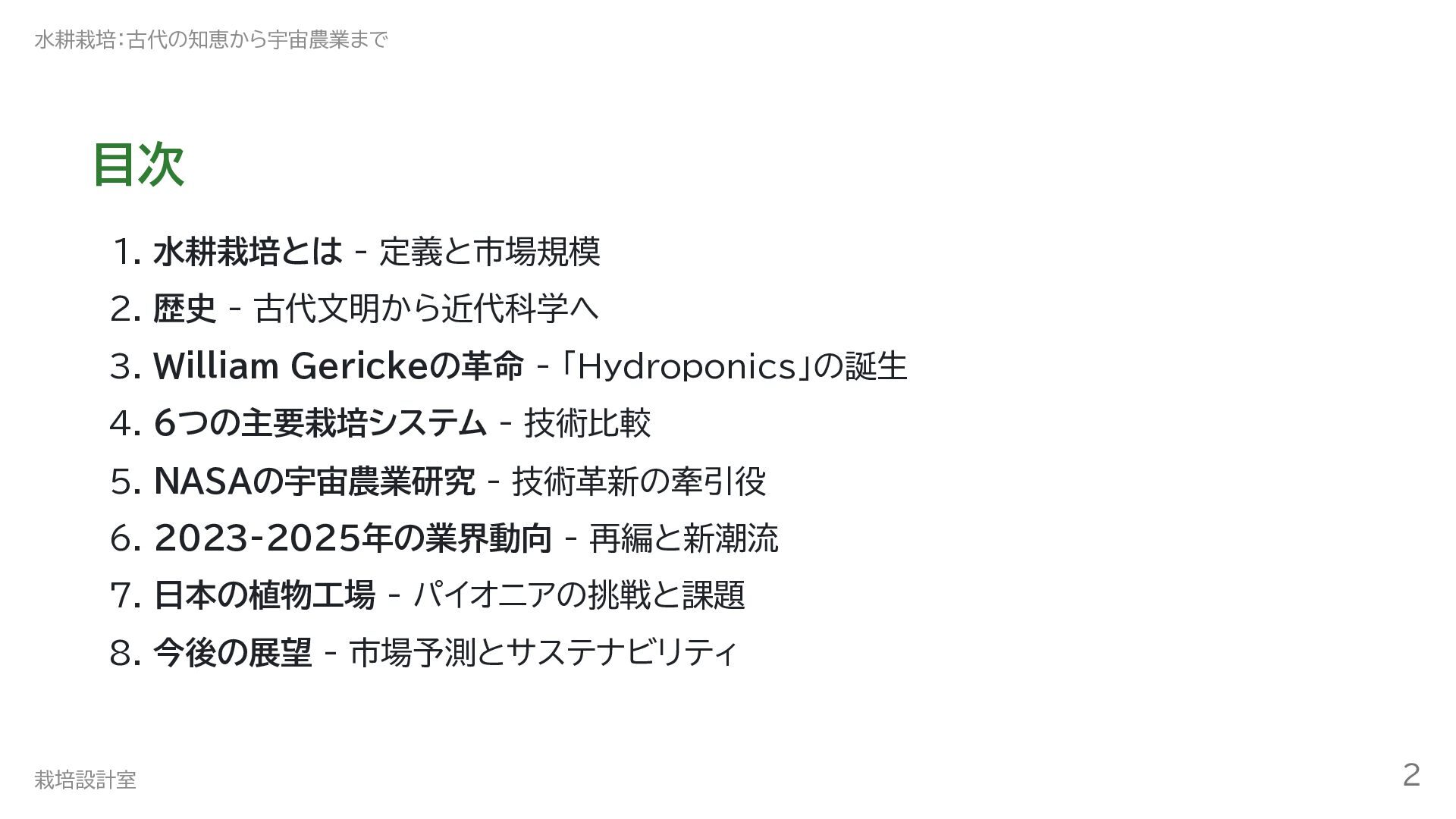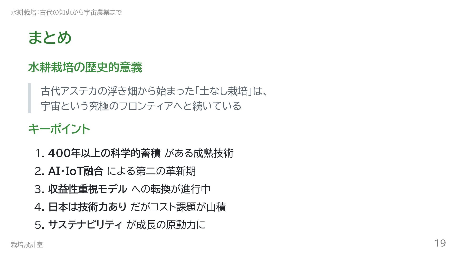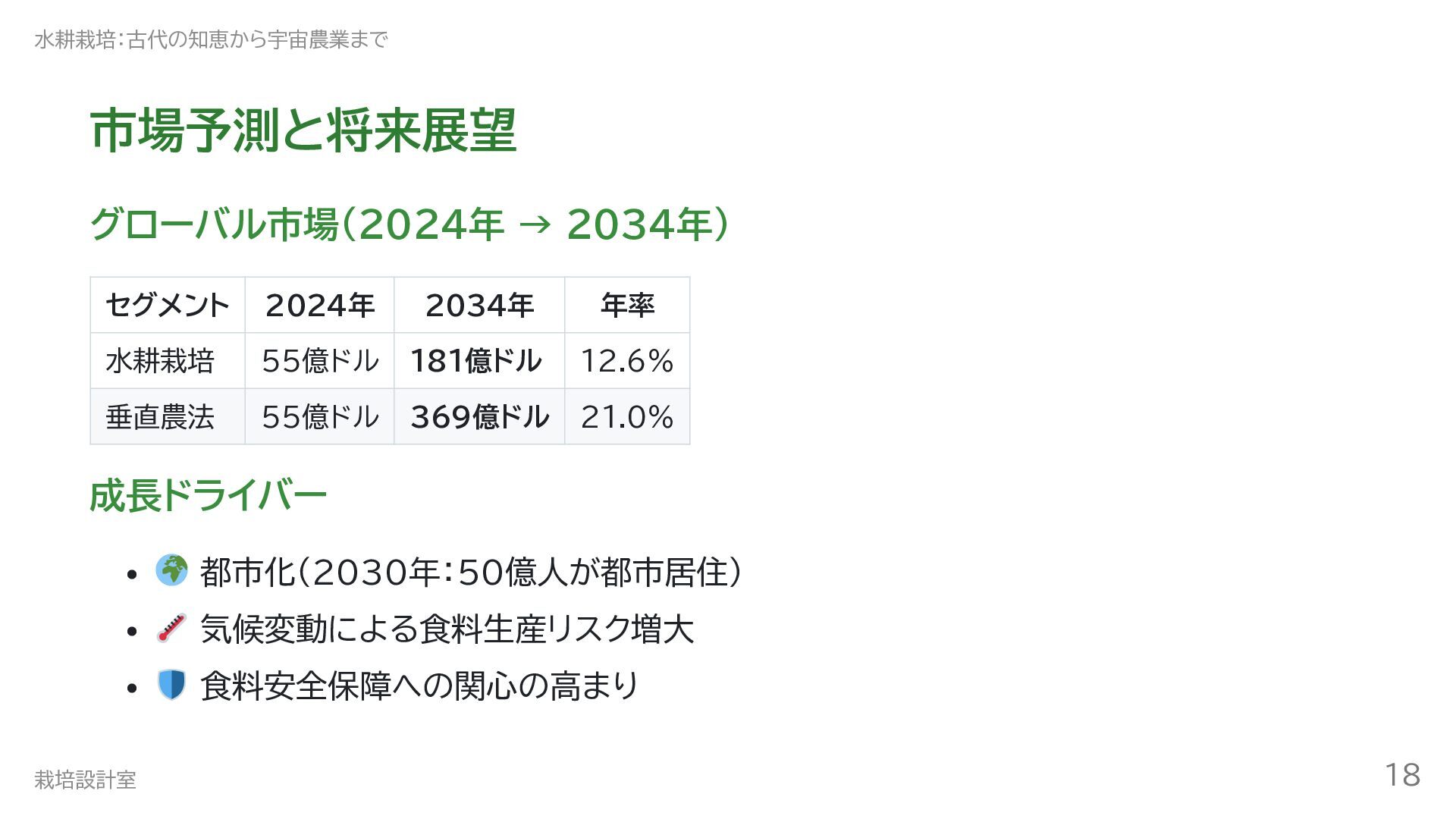 400年以上の科学的蓄積を持つ水耕栽培の全体像を、歴史・技術・ビジネスの3つの視点から概観するスライドです。