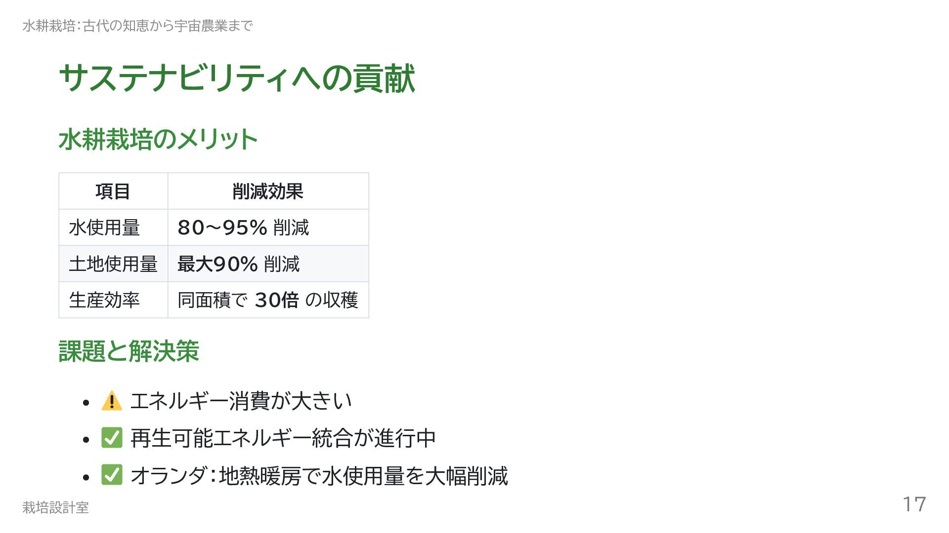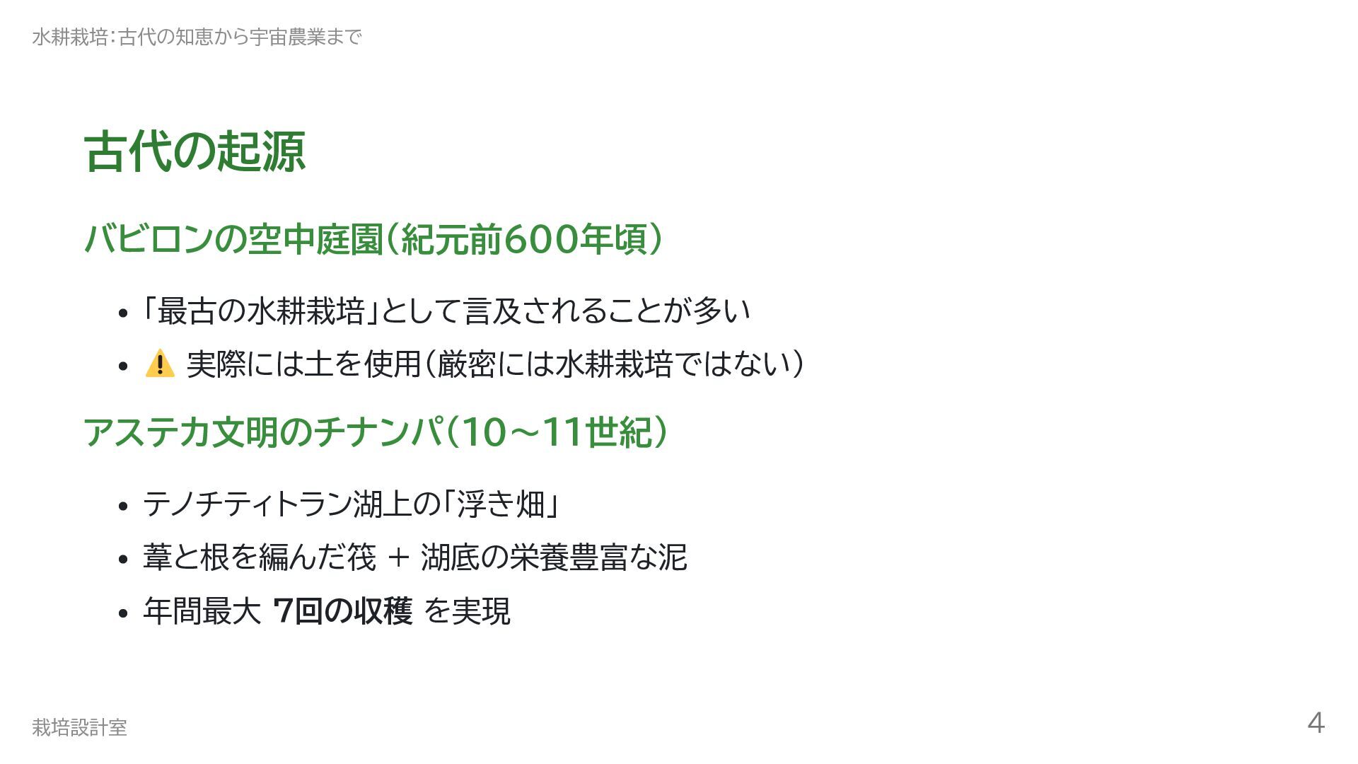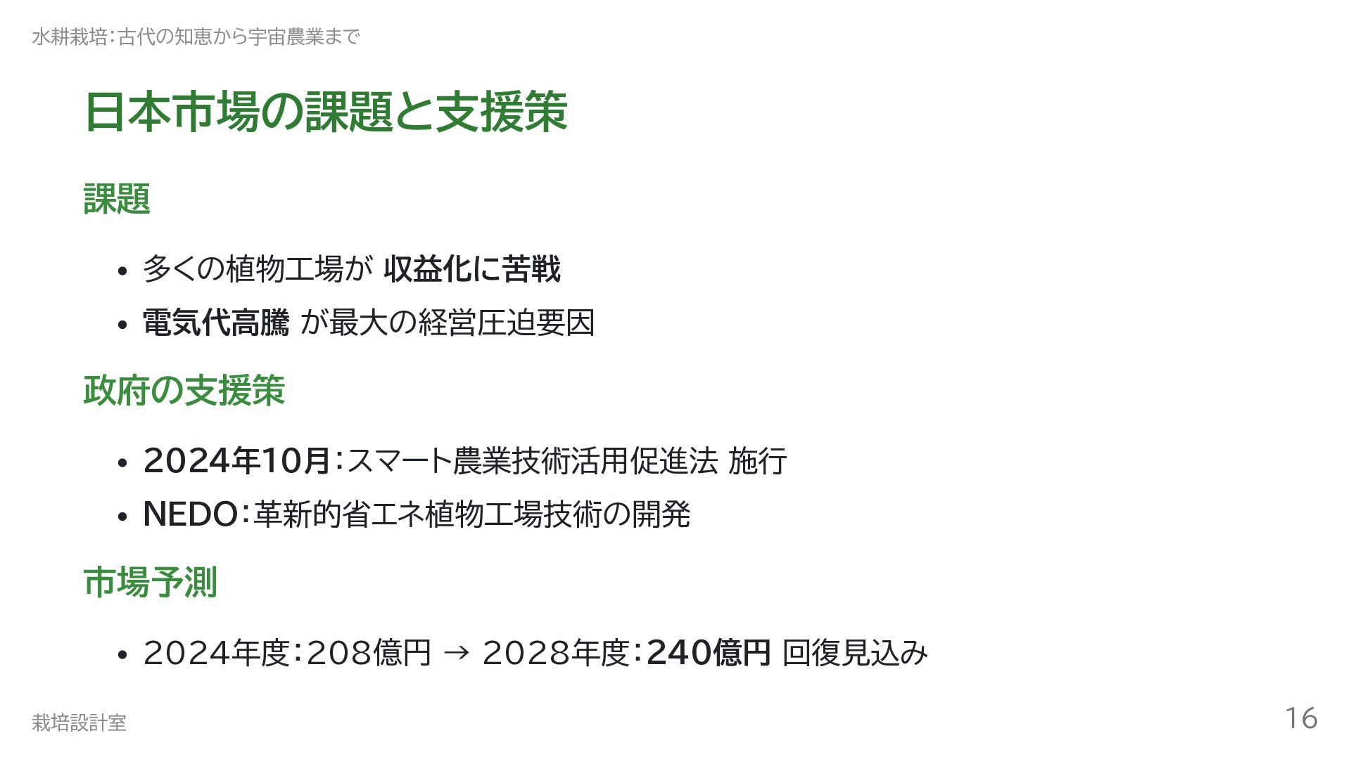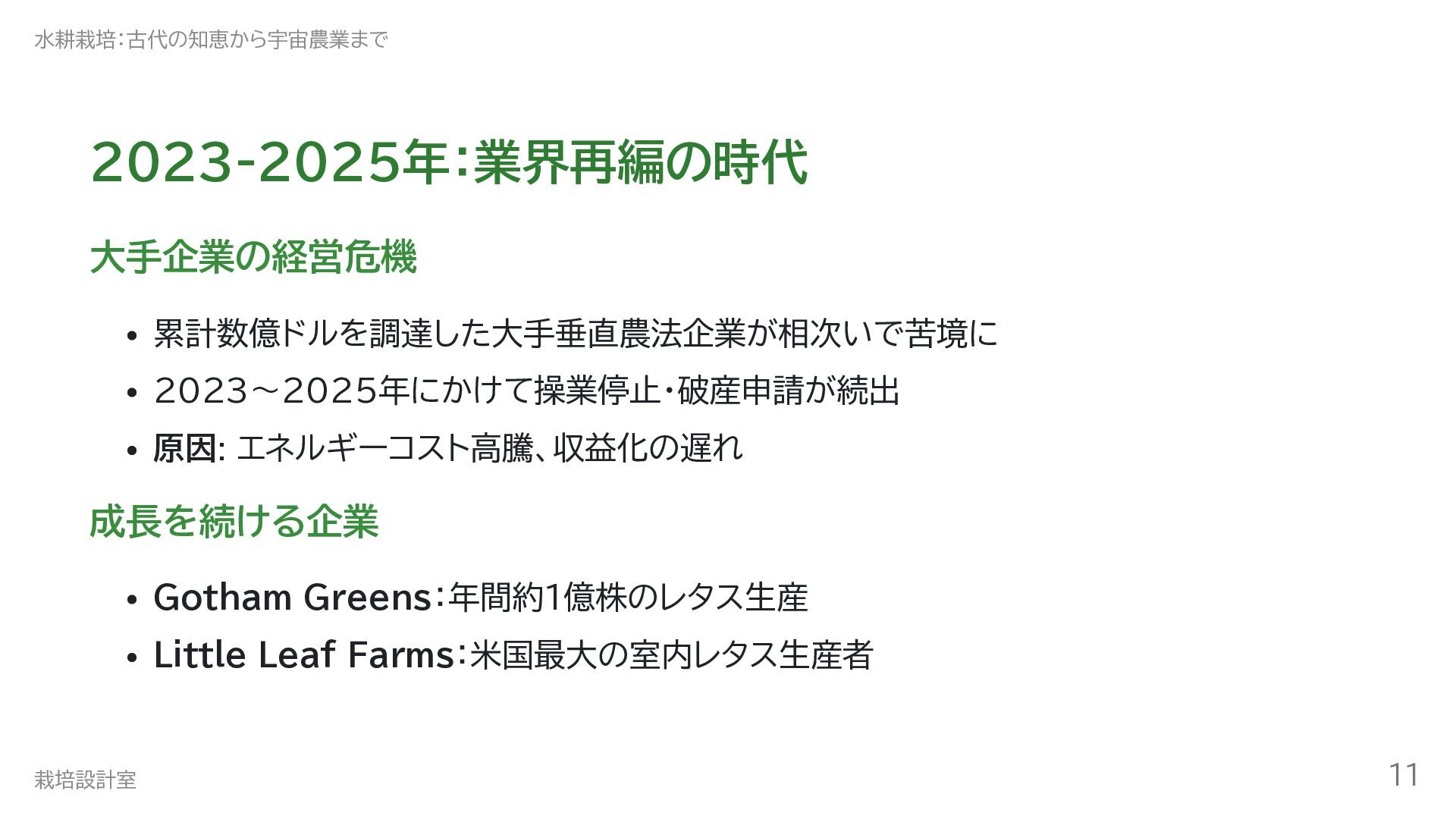 400年以上の科学的蓄積を持つ水耕栽培の全体像を、歴史・技術・ビジネスの3つの視点から概観するスライドです。