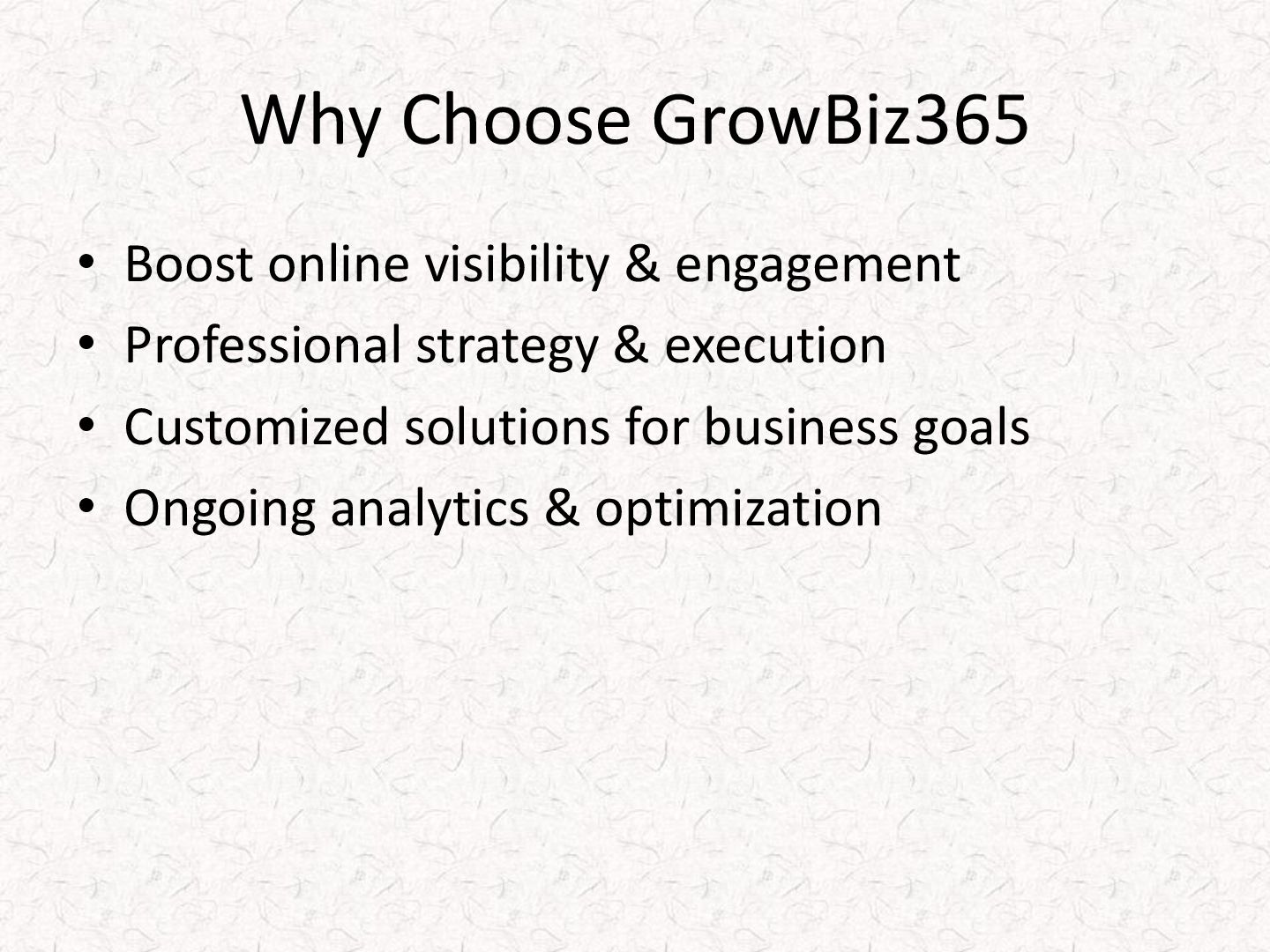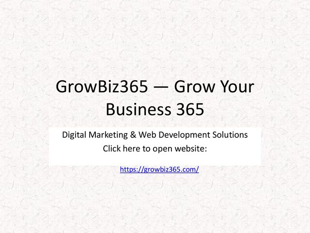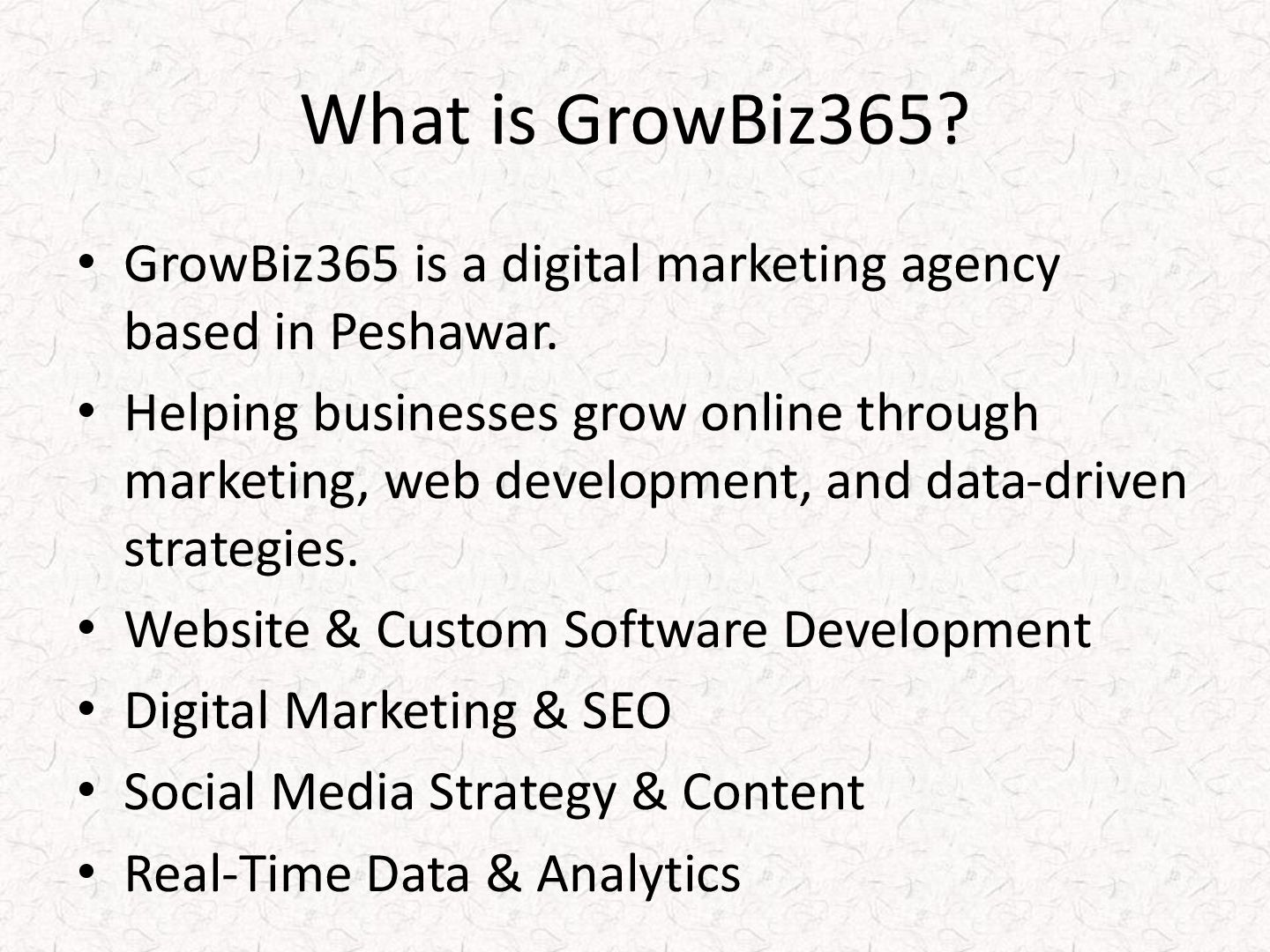 GrowBiz365 is a Peshawar-based digital marketing agency that crafts websites, software, and data-driven marketing campaigns to help businesses increase visibility and sales online.