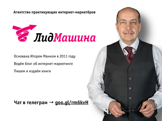 С 2013 года занимаюсь интернет-маркетингом. Разрабатываю и реализую стратегии по улучшению юзабилити, сокращению расходов на рекламу и увеличению прибыли с сайта. Делюсь своими знаниями и опытом в статьях «Учебки» на сайте «ЛидМашины». «ЛидМашину» основал Игорь Манн в 2010 году. В 2015 компания стала лауреатом «Премии Рунета» в номинации «Лучший профессиональный сайт/блог». «ЛидМашина» работает с компаниями: PHILIPS, «КофеХауз», Kaleva, BATBAZA.