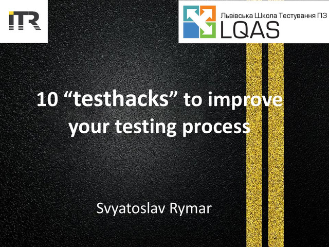 Доповідь буде корисною як тест лідам, які хочуть в короткий термін поліпшити процес тестування, так і тестувальникам, яким небайдужа доля проекту і власна продуктивність. Можливо, деякі поради здадуться Вам простими, інші ж навпаки досить складними в даній ситуації, але головне, що вони працюють, так як були використані не на одному десятку проектів, внесли чіткість і ясність в роботу, додали організованості, зберегли час і гроші, позбавили менеджерів від зайвого клопоту і проблем.
