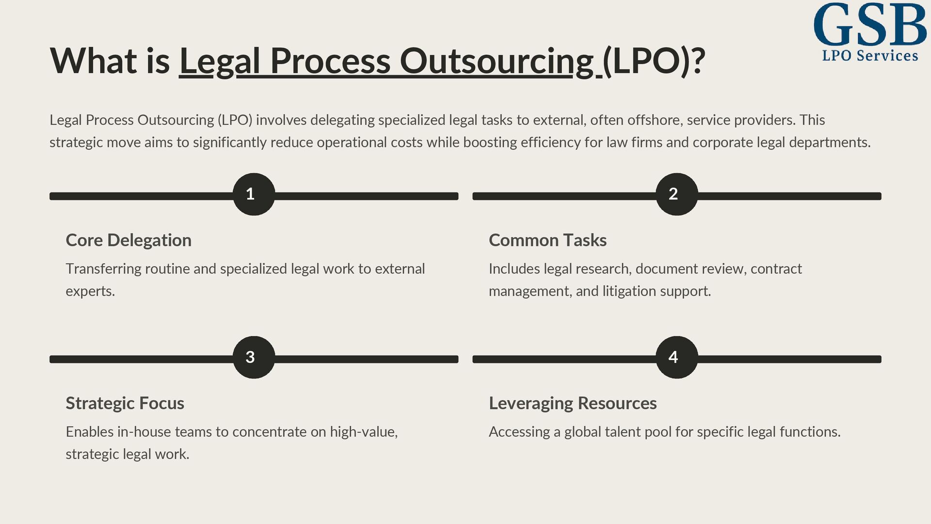 involves delegating specialized legal tasks to external, often offshore, service providers. This strategic move aims to significantly reduce operational costs while boosting efficiency for law firms and corporate legal departments. 1 Core Delegation Transferring routine and specialized legal work to external experts. 2 Common Tasks Includes legal research, document review, contract management, and litigation support. 3 Strategic Focus Enables in-house teams to concentrate on high-value, strategic legal work. 4 Leveraging Resources Accessing a global talent pool for specific legal functions.