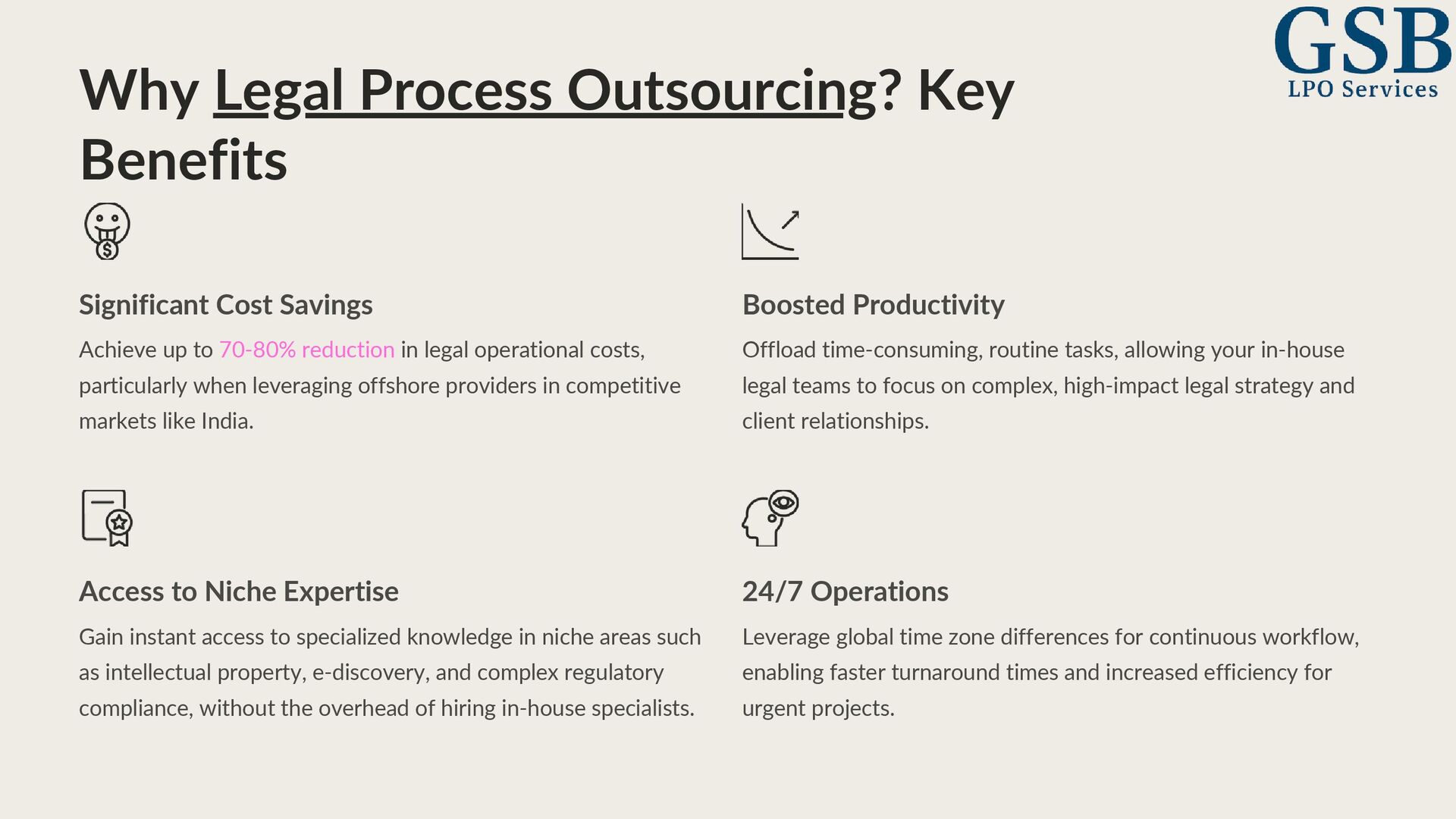 GSB LPO Services: India-based experts in legal process outsourcing since 2007. Cost-effective, secure & on-time support in document review, immigration, bankruptcy, paralegal services.
