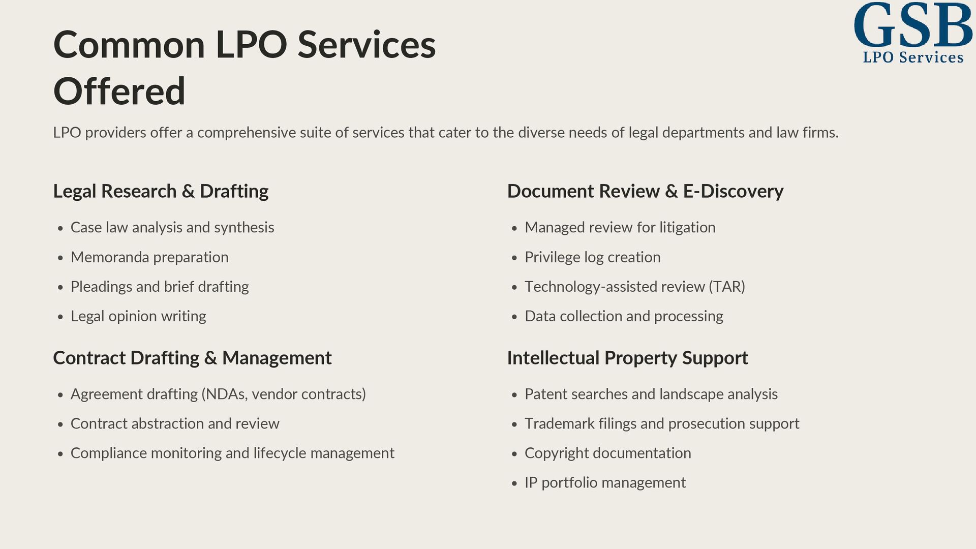 of services that cater to the diverse needs of legal departments and law firms. Legal Research & Drafting Case law analysis and synthesis Memoranda preparation Pleadings and brief drafting Legal opinion writing Contract Drafting & Management Agreement drafting (NDAs, vendor contracts) Contract abstraction and review Compliance monitoring and lifecycle management Document Review & E-Discovery Managed review for litigation Privilege log creation Technology-assisted review (TAR) Data collection and processing Intellectual Property Support Patent searches and landscape analysis Trademark filings and prosecution support Copyright documentation IP portfolio management
