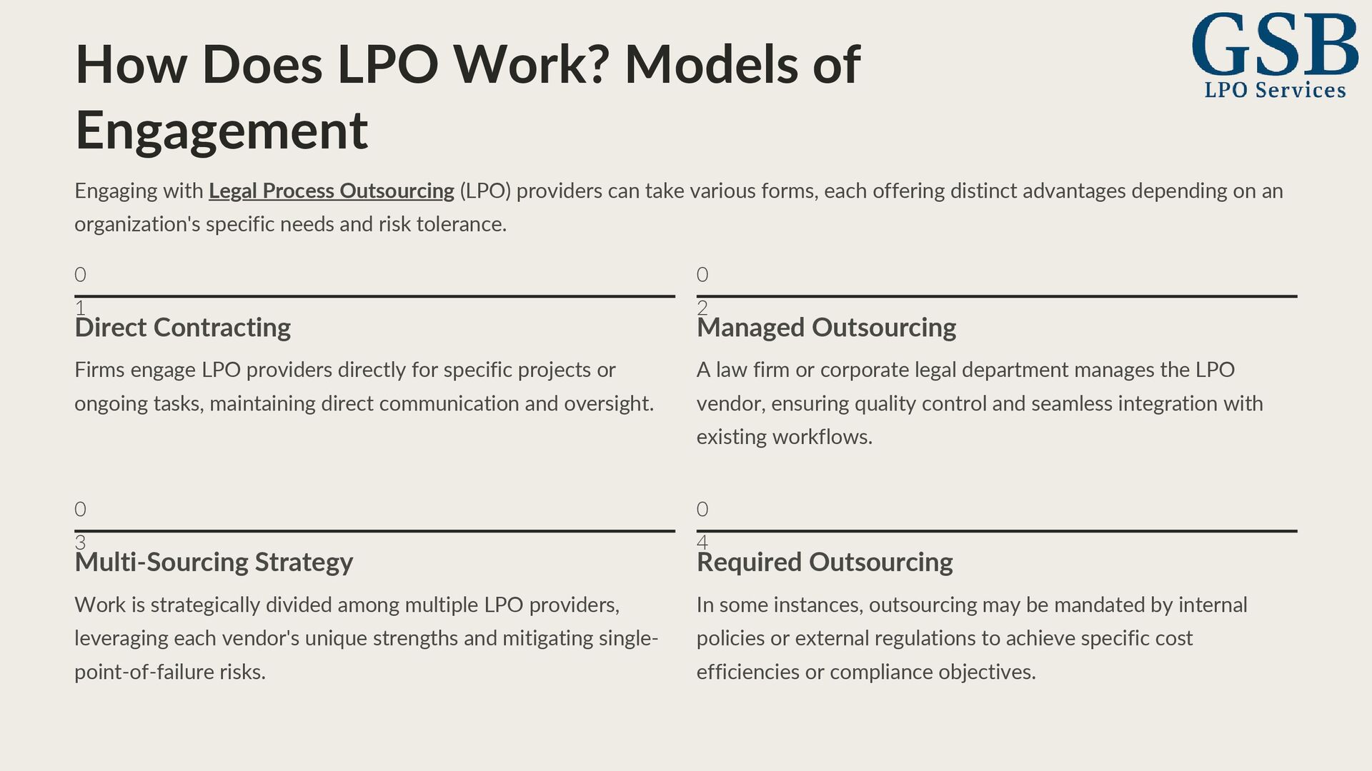 Process Outsourcing (LPO) providers can take various forms, each offering distinct advantages depending on an organization's specific needs and risk tolerance. 0 1 Direct Contracting Firms engage LPO providers directly for specific projects or ongoing tasks, maintaining direct communication and oversight. 0 2 Managed Outsourcing A law firm or corporate legal department manages the LPO vendor, ensuring quality control and seamless integration with existing workflows. 0 3 Multi-Sourcing Strategy Work is strategically divided among multiple LPO providers, leveraging each vendor's unique strengths and mitigating single- point-of-failure risks. 0 4 Required Outsourcing In some instances, outsourcing may be mandated by internal policies or external regulations to achieve specific cost efficiencies or compliance objectives.