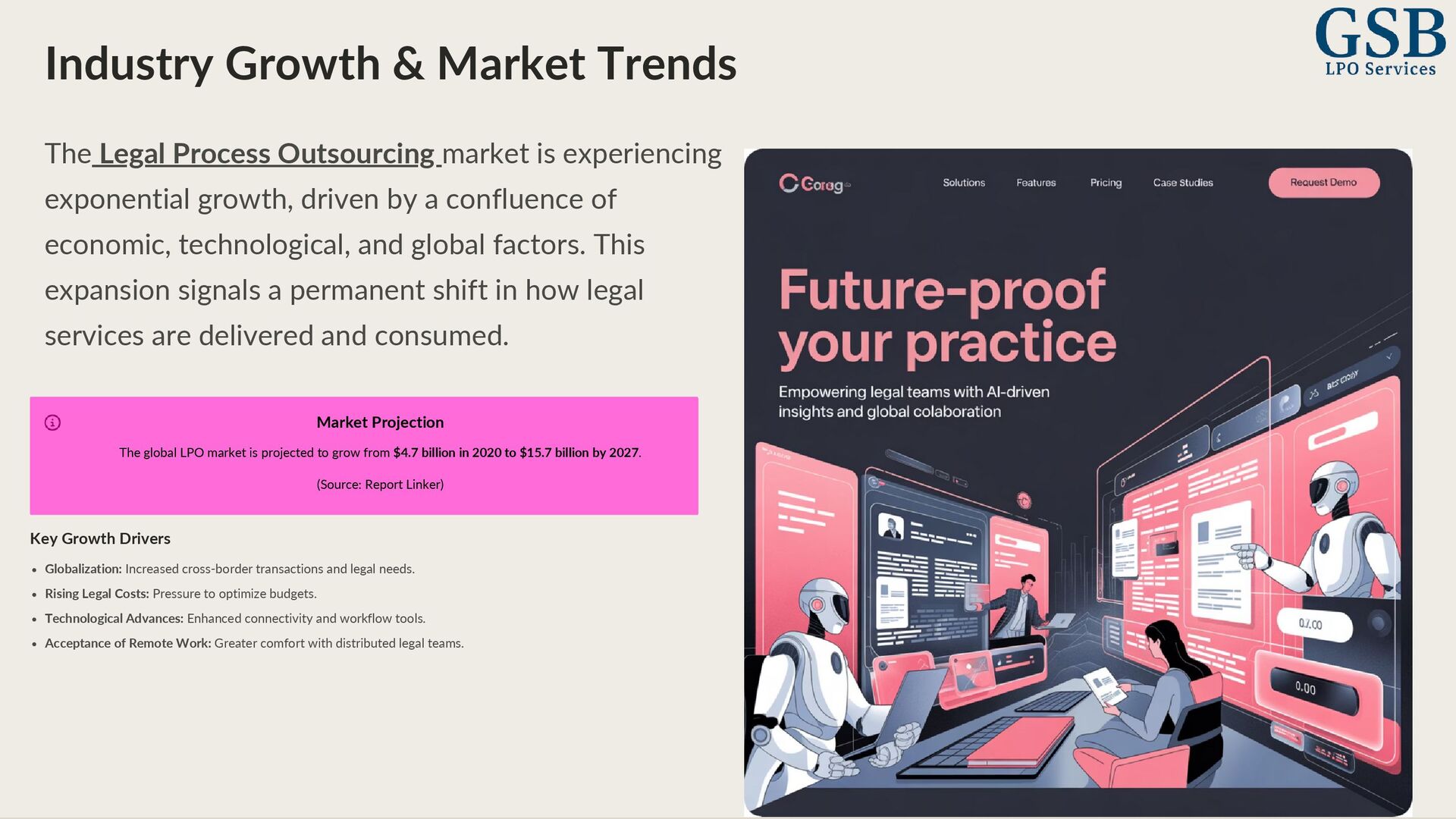 is experiencing exponential growth, driven by a confluence of economic, technological, and global factors. This expansion signals a permanent shift in how legal services are delivered and consumed. Market Projection The global LPO market is projected to grow from $4.7 billion in 2020 to $15.7 billion by 2027. (Source: Report Linker) Key Growth Drivers Globalization: Increased cross-border transactions and legal needs. Rising Legal Costs: Pressure to optimize budgets. Technological Advances: Enhanced connectivity and workflow tools. Acceptance of Remote Work: Greater comfort with distributed legal teams.