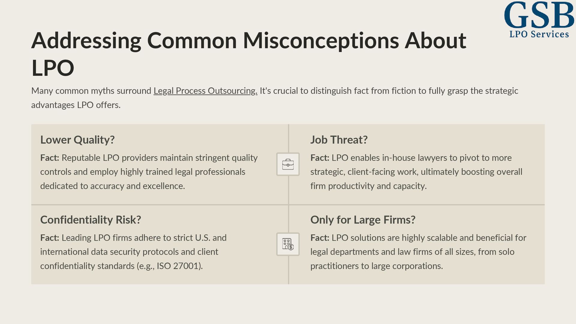 Process Outsourcing. It's crucial to distinguish fact from fiction to fully grasp the strategic advantages LPO offers. Lower Quality? Fact: Reputable LPO providers maintain stringent quality controls and employ highly trained legal professionals dedicated to accuracy and excellence. Job Threat? Fact: LPO enables in-house lawyers to pivot to more strategic, client-facing work, ultimately boosting overall firm productivity and capacity. Confidentiality Risk? Fact: Leading LPO firms adhere to strict U.S. and international data security protocols and client confidentiality standards (e.g., ISO 27001). Only for Large Firms? Fact: LPO solutions are highly scalable and beneficial for legal departments and law firms of all sizes, from solo practitioners to large corporations.