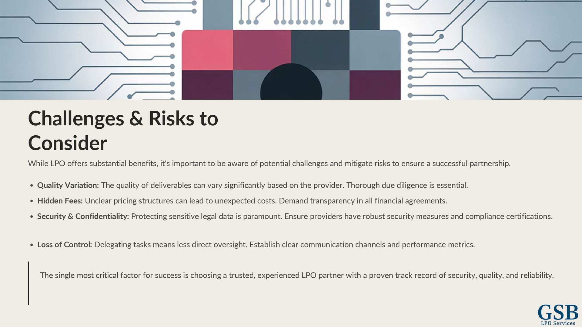 it's important to be aware of potential challenges and mitigate risks to ensure a successful partnership. Quality Variation: The quality of deliverables can vary significantly based on the provider. Thorough due diligence is essential. Hidden Fees: Unclear pricing structures can lead to unexpected costs. Demand transparency in all financial agreements. Security & Confidentiality: Protecting sensitive legal data is paramount. Ensure providers have robust security measures and compliance certifications. Loss of Control: Delegating tasks means less direct oversight. Establish clear communication channels and performance metrics. The single most critical factor for success is choosing a trusted, experienced LPO partner with a proven track record of security, quality, and reliability.