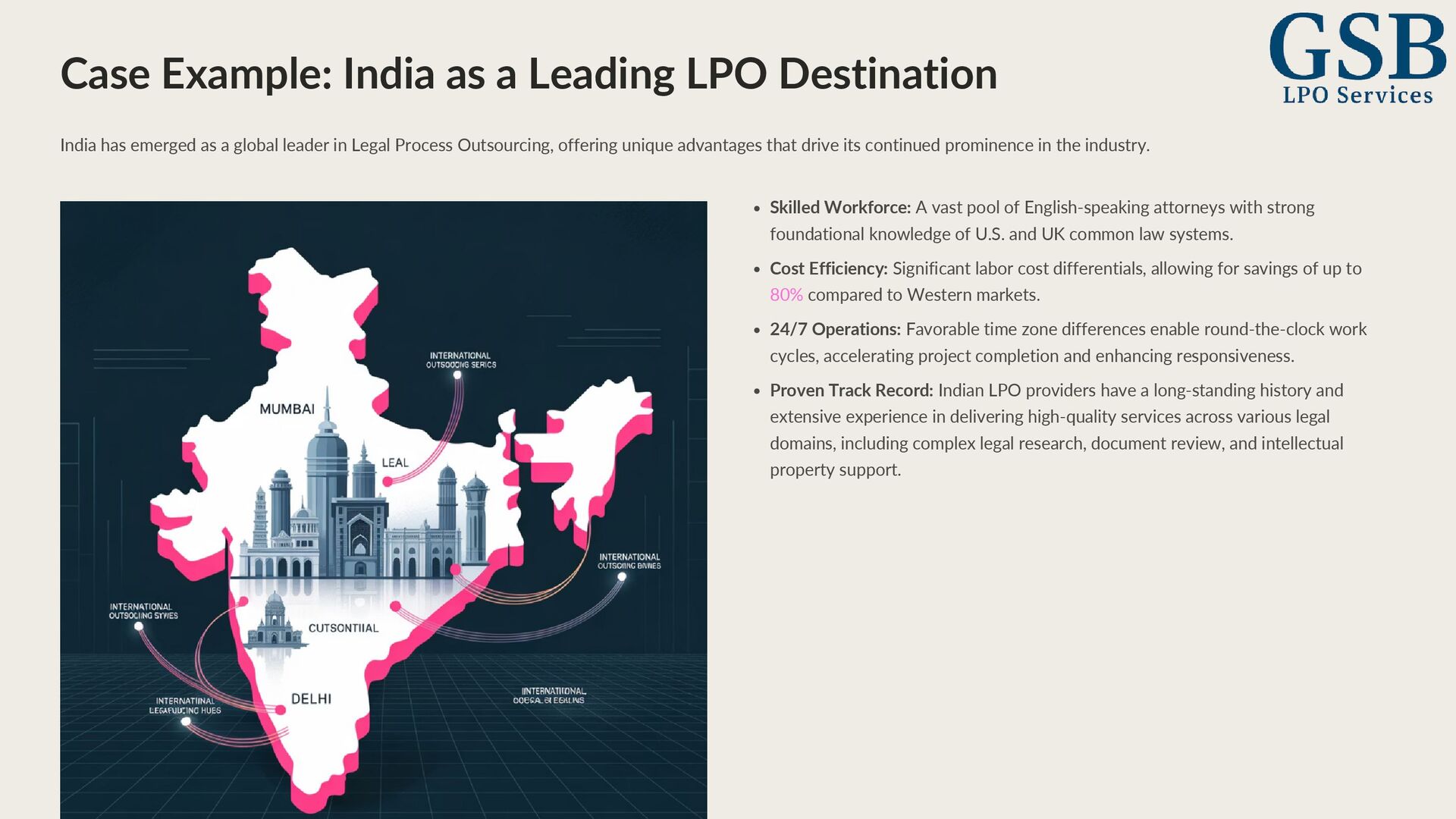 emerged as a global leader in Legal Process Outsourcing, offering unique advantages that drive its continued prominence in the industry. Skilled Workforce: A vast pool of English-speaking attorneys with strong foundational knowledge of U.S. and UK common law systems. Cost Efficiency: Significant labor cost differentials, allowing for savings of up to 80% compared to Western markets. 24/7 Operations: Favorable time zone differences enable round-the-clock work cycles, accelerating project completion and enhancing responsiveness. Proven Track Record: Indian LPO providers have a long-standing history and extensive experience in delivering high-quality services across various legal domains, including complex legal research, document review, and intellectual property support.
