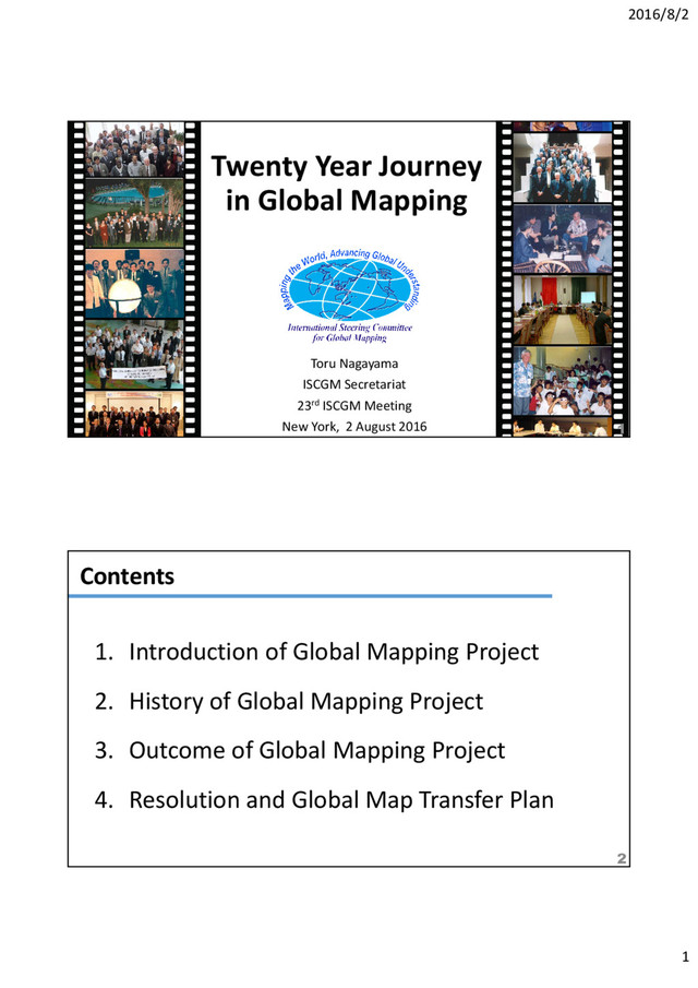 ISCGM Secretariat 23rd ISCGM Meeting New York, 2 August 2016 1 Contents 1. Introduction of Global Mapping Project 2. History of Global Mapping Project 3. Outcome of Global Mapping Project 4. Resolution and Global Map Transfer Plan 2