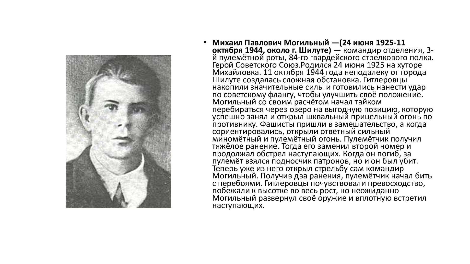 г. Шилуте) — командир отделения, 3- й пулемётной роты, 84-го гвардейского стрелкового полка. Герой Советского Союз.Родился 24 июня 1925 на хуторе Михайловка. 11 октября 1944 года неподалеку от города Шилуте создалась сложная обстановка. Гитлеровцы накопили значительные силы и готовились нанести удар по советскому флангу, чтобы улучшить своё положение. Могильный со своим расчётом начал тайком перебираться через озеро на выгодную позицию, которую успешно занял и открыл шквальный прицельный огонь по противнику. Фашисты пришли в замешательство, а когда сориентировались, открыли ответный сильный миномётный и пулемётный огонь. Пулемётчик получил тяжёлое ранение. Тогда его заменил второй номер и продолжал обстрел наступающих. Когда он погиб, за пулемёт взялся подносчик патронов, но и он был убит. Теперь уже из него открыл стрельбу сам командир Могильный. Получив два ранения, пулемётчик начал бить с перебоями. Гитлеровцы почувствовали превосходство, побежали к высотке во весь рост, но неожиданно Могильный развернул своё оружие и вплотную встретил наступающих.