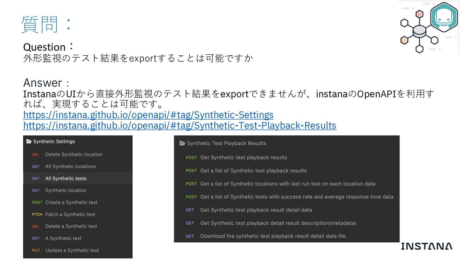 質問: Question: 外形監視のテスト結果をexportすることは可能ですか Answer: InstanaのUIから直接外形監視のテスト結果をexportできませんが、instanaのOpenAPIを利⽤す れば、実現することは可能です。 https://instana.github.io/openapi/#tag/Synthetic-Settings https://instana.github.io/openapi/#tag/Synthetic-Test-Playback-Results