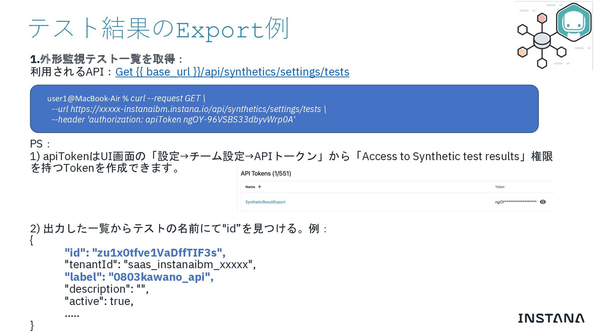 --url https://sesandbox-instana.instana.io/api/events/settings/event-specifications/custom \ --header 'authorization: apiToken cO5EU540RKy4DhHsxi7hxQ’ PS: 1) apiTokenはUI画面の「設定→チーム設定→APIトークン」から「Access to Synthetic test results」権限 を持つTokenを作成できます。 2) 出力した一覧からテストの名前にて"id”を見つける。例: { "id": "zu1x0tfve1VaDffTIF3s", "tenantId": "saas_instanaibm_xxxxx", "label": "0803kawano_api", "description": "", "active": true, ….. } user1@MacBook-Air % curl --request GET \ --url https://xxxxx-instanaibm.instana.io/api/synthetics/settings/tests \ --header 'authorization: apiToken ngOY-96VSBS33dbyvWrp0A'