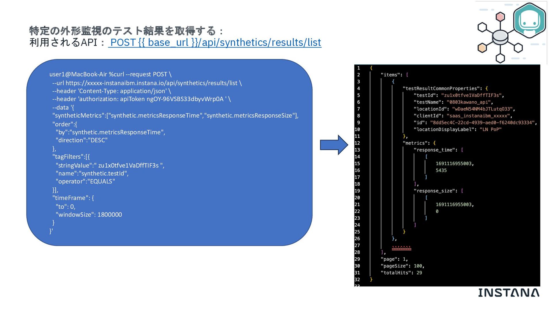 Instana Open API を利用して、外形監視テスト結果の取得を実装しています。