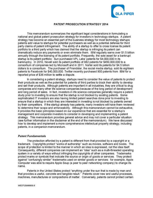 mental processes; or mathematical algorithms. Patent law requires that an invention be “useful”, “novel“ and “non-obvious”. The usefulness requirement is generally easy to meet: the invention must have some utility; achieve some objective; and is not against public policy. An invention is “novel” when it is new, i.e. different from the “prior art.” Finally an invention must be non-obvious; i.e. the subject matter as a whole would not have been obvious at the time to a person of ordinary skill in the art. The criteria of novelty and non- obviousness are more difficult to fulfill. The patent grant is a negative right – a right to exclude. A patent does not provide a right to practice the patented invention – it is not a right to make a product or provide a service. This distinction is important because a single product may be covered by more than one patent owned by different parties. For example, a semiconductor may be covered by thousands of patents owned by different parties. A patent is only enforceable once issued; patent applications do not provide any legal rights, but there are provisional rights conferred based upon the publication of an application with claims that ultimately issue. A United States patent affords its owner five (5) “negative” rights – the right to exclude others from making, using, selling, offering for sale, or importing the patented invention in the United States – for a limited period of twenty (20) years from the patent’s earliest filing date. Under certain limited conditions, this term can be extended. United States and Foreign Patent Systems – Generally Patent rights must be acquired on a country by country basis. These rights vary from country to country, and do not extend beyond a country’s territorial boundaries. In the United States, the United States Patent and Trademark Office (“PTO”) in Washington D.C. examines United States patent applications and issues United States patents. Unlike copyrights and certain trademark rights, the process of obtaining a patent in the United States is an adversarial proceeding in which the applicant must persuade the PTO that his application meets the criteria of the law (the patent law in the United States changed very substantially on March 1, 2013 and this memorandum does not deal with the differences for patents filed prior to that date; if you have questions about such issues, please contact us). A startup may file individual applications in each country. However, most companies take advantage of a treaty that permits a global patent application filing process, the Patent Cooperation Treaty (PCT) application, which works in most major countries. The World Intellectual Property Organization (WIPO) administers the PCT filing process, but each PCT application must eventually be prosecuted in an individual country to obtain issuance of a patent. Therefore, a PCT application is not an international patent application and in fact there is no such thing as an international patent application. In addition, several regions have their own patent conventions that permit issuance of patents with regional effect. The most important of these regional patent conventions for technology startups is the European Patent Convention administered by the European Patent Office (EPO) and through which a European Patent is issued which is effective in all of the countries to which the startup chooses to extend it (the European Patent is described in more detail below). The states of the EPO are: Austria, Belgium, Bulgaria, Cyprus, Czech Republic, Denmark, Estonia, Finland, France, Germany, Hellenic Republic, Hungary, Ireland, Italy, Liechtenstein, Luxembourg, Monaco, Netherlands, Poland, Portugal, Romania, Slovakia, Slovenia, Spain, Sweden, Switzerland, Turkey, and the United Kingdom. The United States patent system has two major differences from the patent system in virtually all other countries: (1) the United States permits the filing of a patent application within
