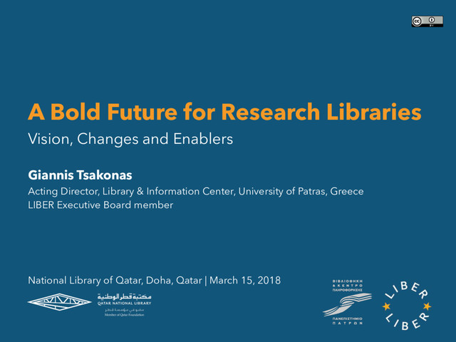 This talk will present the main pillars of LIBER’s vision and will provide examples illustrating the transformation of research libraries. It will provide an international reference point in the weeks before the Third Forum of the Library and Information Association of Qatar (LIA-Q) under the theme “Libraries in Qatar: Working together towards the Country National Vision 2030”.