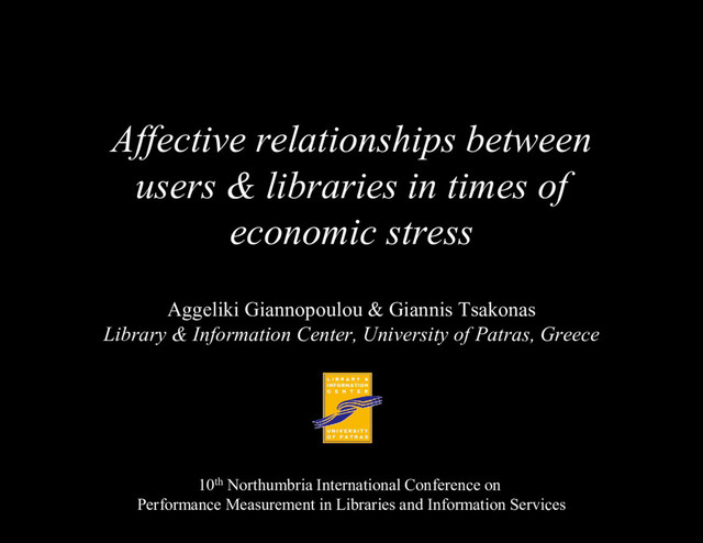 Academic libraries are considered as key factors in the educational system of a country and strong pylons for the economic and societal development. During the current economic recession, libraries have been struck by severe budget cuts that have forced them to shrink and to reconsider services to the end users. Important questions that have been raised in countries, such as Greece, which has been in the eye storm of the economic downturn and has witnessed severe societal changes, include how libraries respond to this change of conditions, how they improve their service level and how they minimize user dissatisfaction. Moreover, one of the key questions is what is the range of substantial or symbolic interventions that can improve users’ affective relationship with the libraries? The study aimed to measure the opinion of academic libraries users on four main criteria categories, namely cost, space and atmosphere, personnel behavior, and facilitation of collaborative work, and to reflect the level of affective relationship of users with their libraries. The study provides representative findings from all Greek academic libraries and shows that libraries are considered as spaces that facilitate pleasant reading and studying, as well as efficient collaborative work. Library users are in overall satisfied by the personnel behavior and productivity, but they also believe that there are margins for further improvement of its knowledge, while they think that the cost of services should be revised and echo the current situation. The findings of the study can assist library administrators to define the range of interventions and to prioritize them in a period of limited resources.