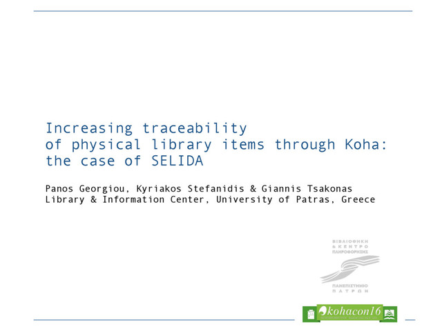 Presentation in KohaCon2016, the major event of Koha community, on May 31, 2016. The Library & Information Center, University of Patras, Greece has developed the SELIDA framework, which integrates a set of standardized and widespread library technologies in order to increase the identification and traceability of physical items, such as books. The framework makes use of RFID tags in order to assign unique identification marks, in the form of URIs that can be globally exchanged. The framework has been implemented in the fully translated and customized Koha installation of our Library and its core services support checking in/out of books and browsing of history transactions with geospatial visualization. Its use can support transactions between various libraries or branches of the same library. The proposed presentation will describe the architecture of the framework and how it connects to Koha, as well as the challenges we faced during its development.