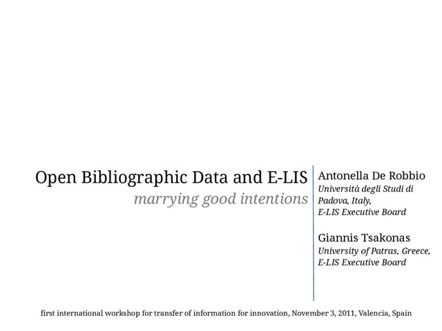 Robbio Università degli Studi di Padova, Italy, E-LIS Executive Board Giannis Tsakonas University of Patras, Greece, E-LIS Executive Board first international workshop for transfer of information for innovation, November 3, 2011, Valencia, Spain