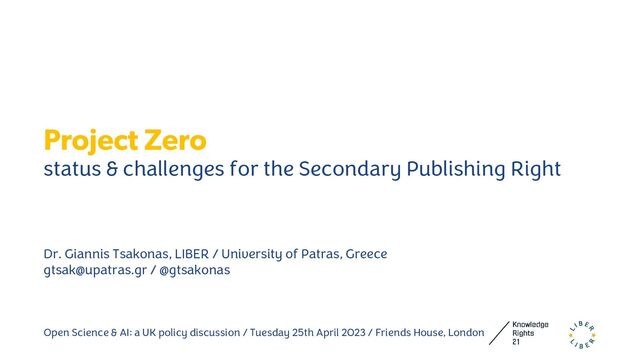 Presentation of the preliminary findings of the survey that has been conducted by LIBER in the frame of the Arcadia funded Knowledge Rights 21 program in the "Open Science & AI: a UK policy discussion" event at Tuesday 25th April 2023 in Friends House, London.
