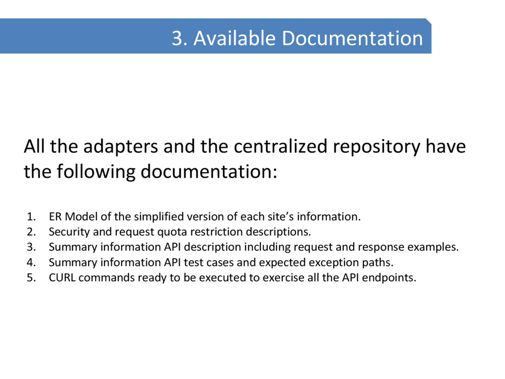 have the following documentation: 1. ER Model of the simplified version of each site’s information. 2. Security and request quota restriction descriptions. 3. Summary information API description including request and response examples. 4. Summary information API test cases and expected exception paths. 5. CURL commands ready to be executed to exercise all the API endpoints.