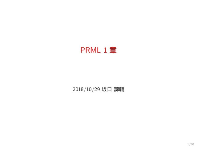 t ɺฏۉ͕ y(x, w) Ͱ͋ΔҎԼͷΨε ʹै͏ͱ͢Δ (β−1 = σ2) p(t|x, w, β) = N(t|y(x, w), β−1) (1.60) ▶ ܇࿅σʔλ (x, t) Λ༻͍ͯɺҎԼͷؔΛ࠷େʹ͢ΔΑ͏ͳύ ϥϝʔλ w, β ΛٻΊΔ p(t|x, w, β) = N ∏ n=1 N(tn |y(xn , w), β−1) (1.61) ▶ ࣮ࡍͷܭࢉͰɺҎԼͷରΛ࠷େʹ͢ΔΑ͏ͳ w, β Λٻ ΊΔ ln p(t|x, w, β) = − β 2 N ∑ n=1 (y(xn , w) − tn )2 + N 2 ln β − N 2 ln(2π) (1.62) 25 / 55