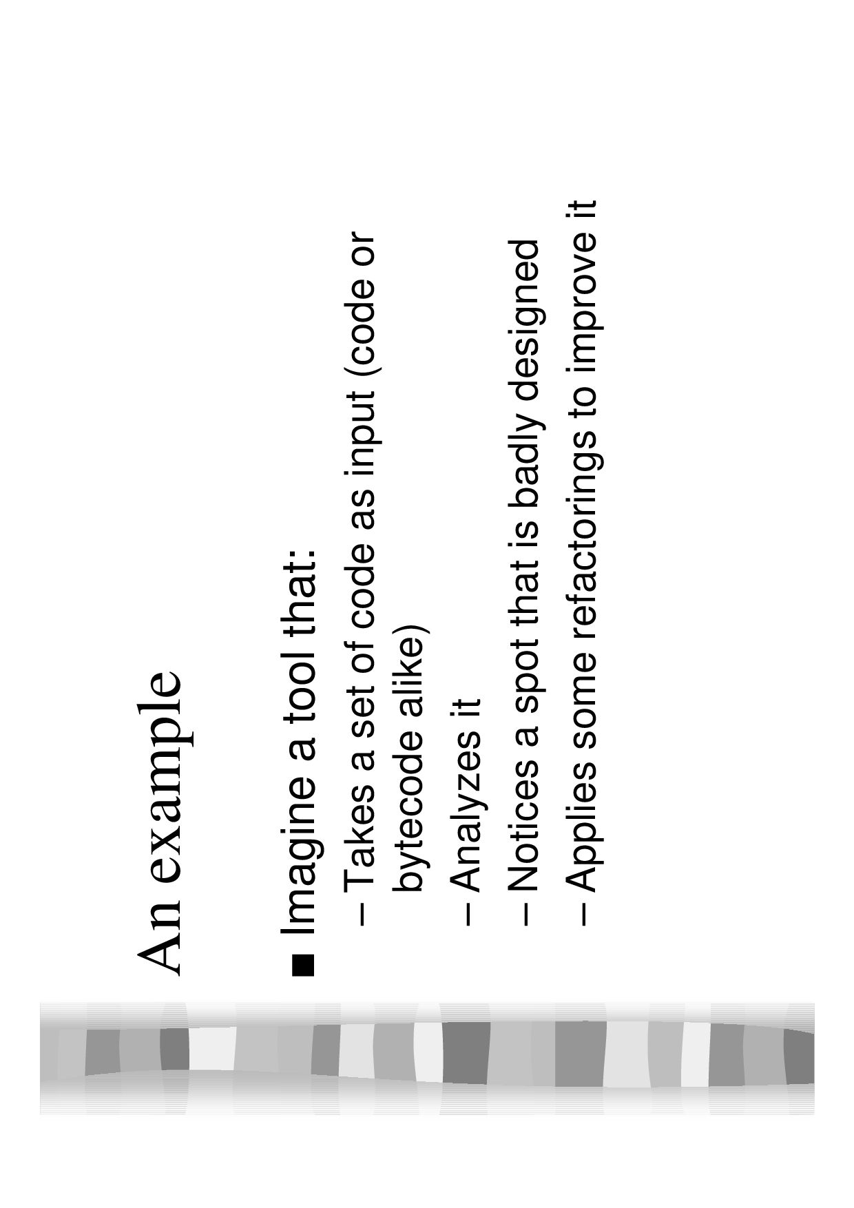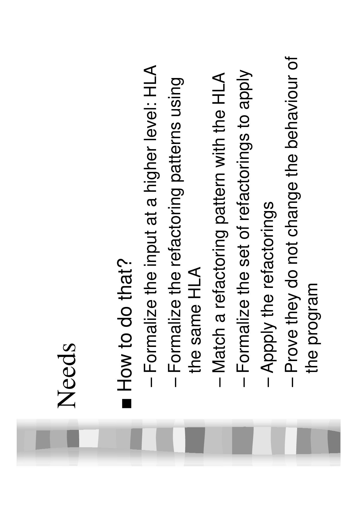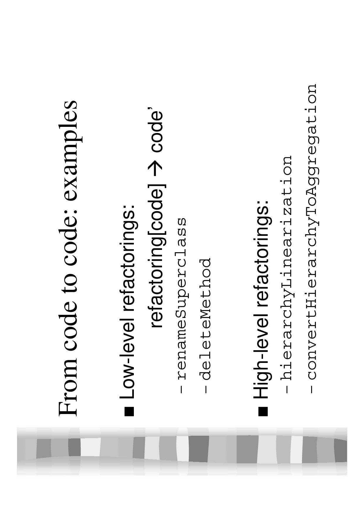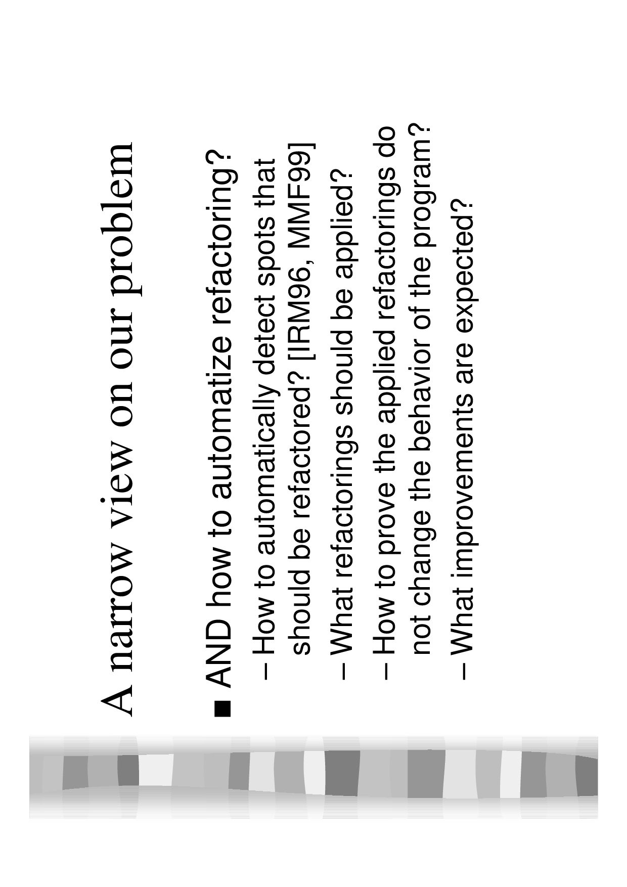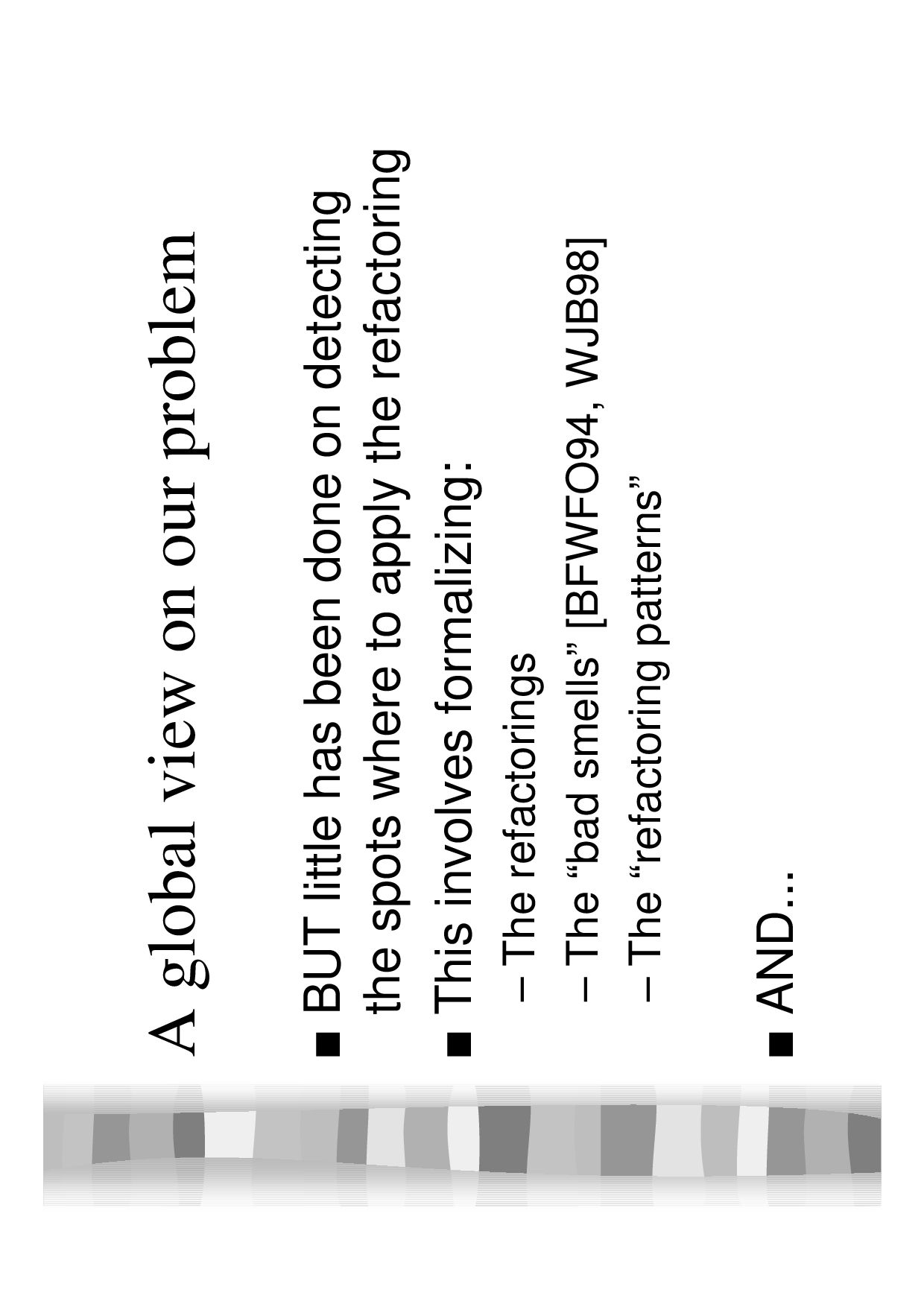 focuses on refactorings: – What refactorings are interesting? [MF99] – How to prove they don’t change the behaviour of the program? [WFO92, DBR99] – How to compose them? [MÓC00] – How to support them [DR97, JREFACTORY, IJRENAMER, XREFACTORY] I BUT...