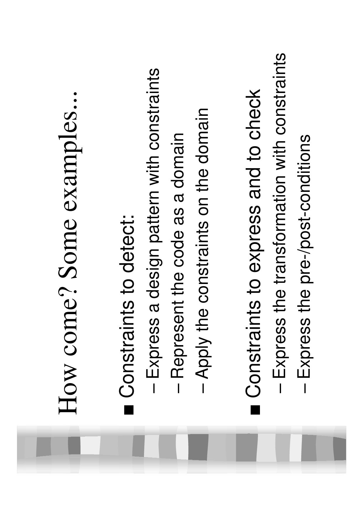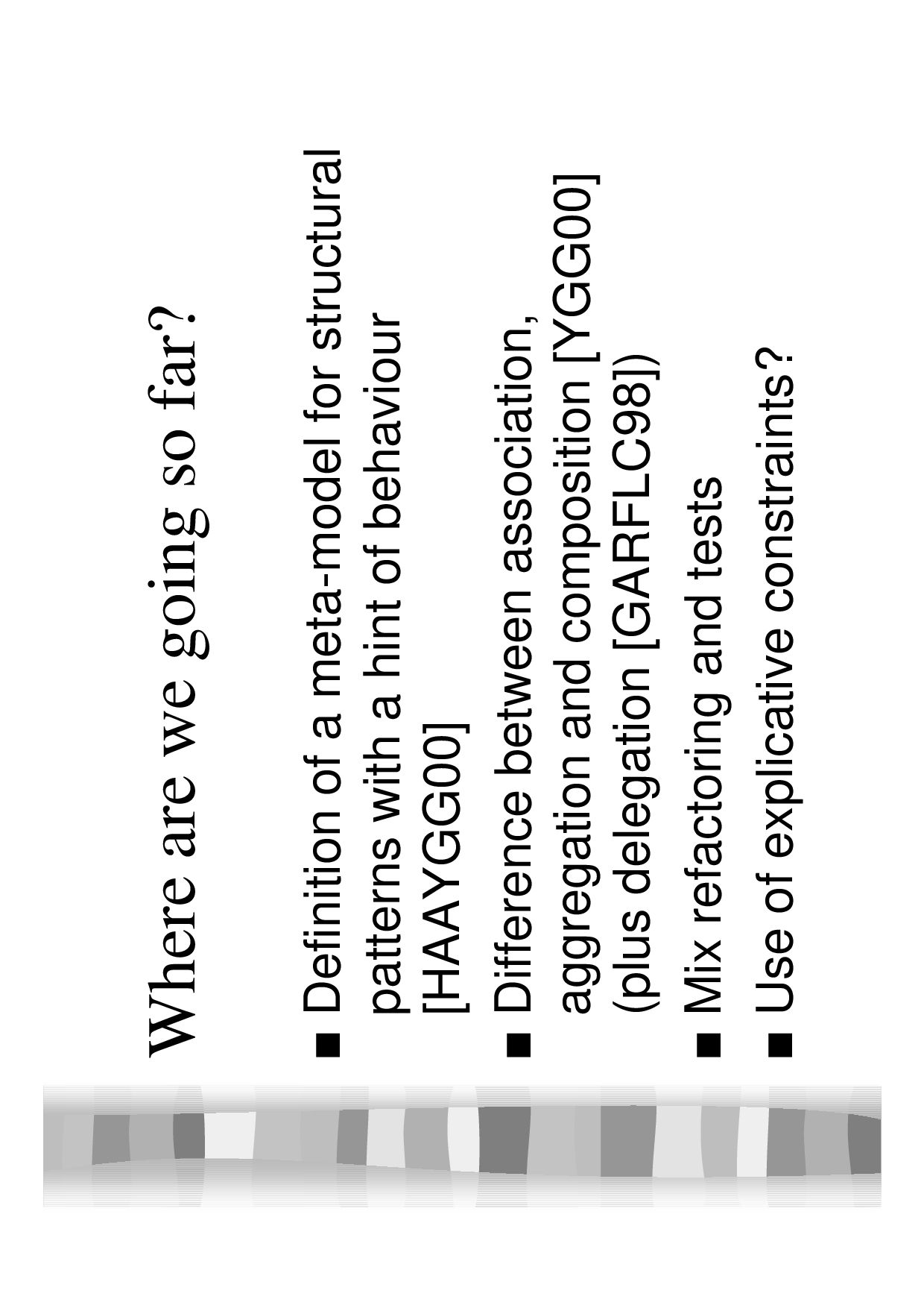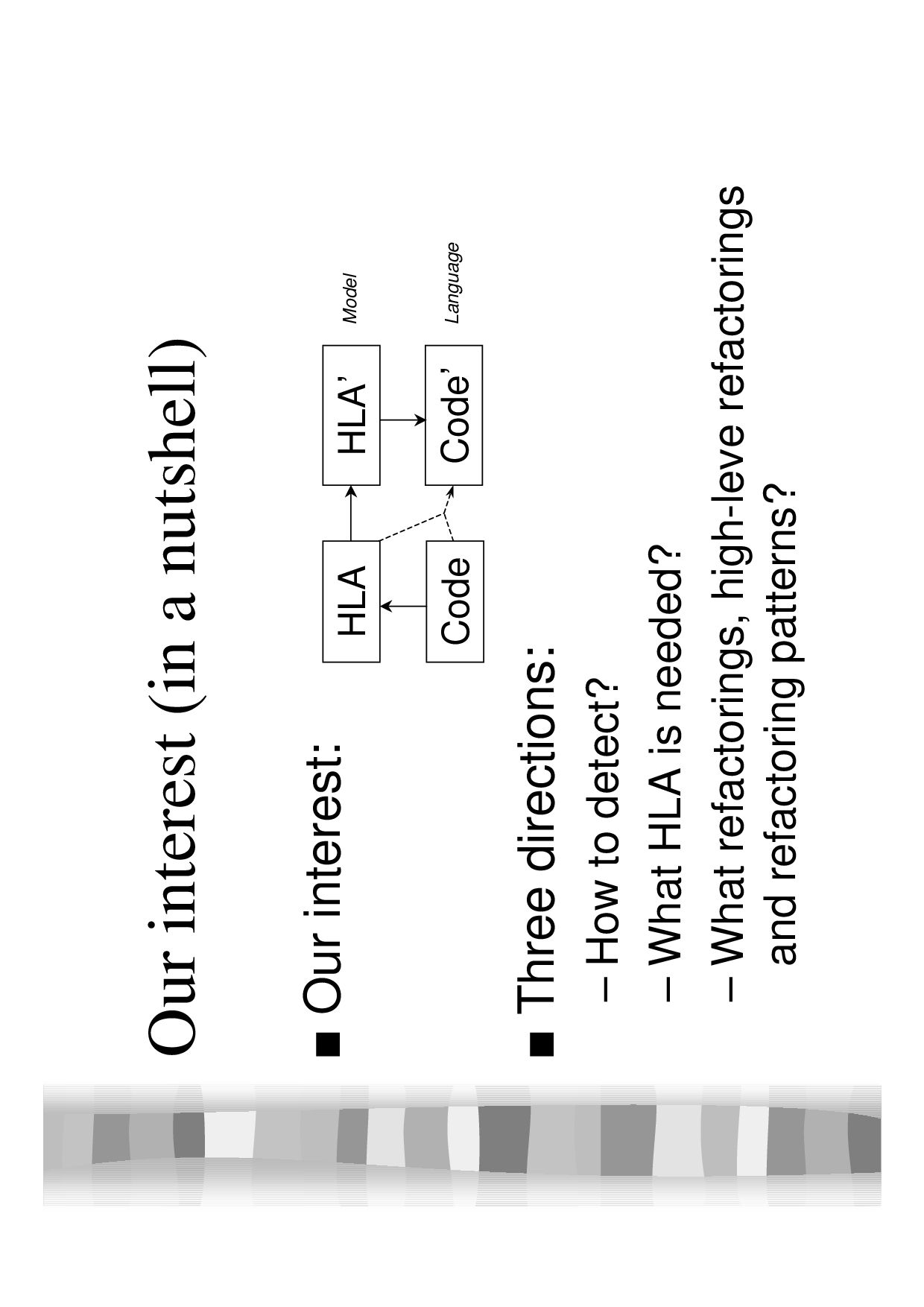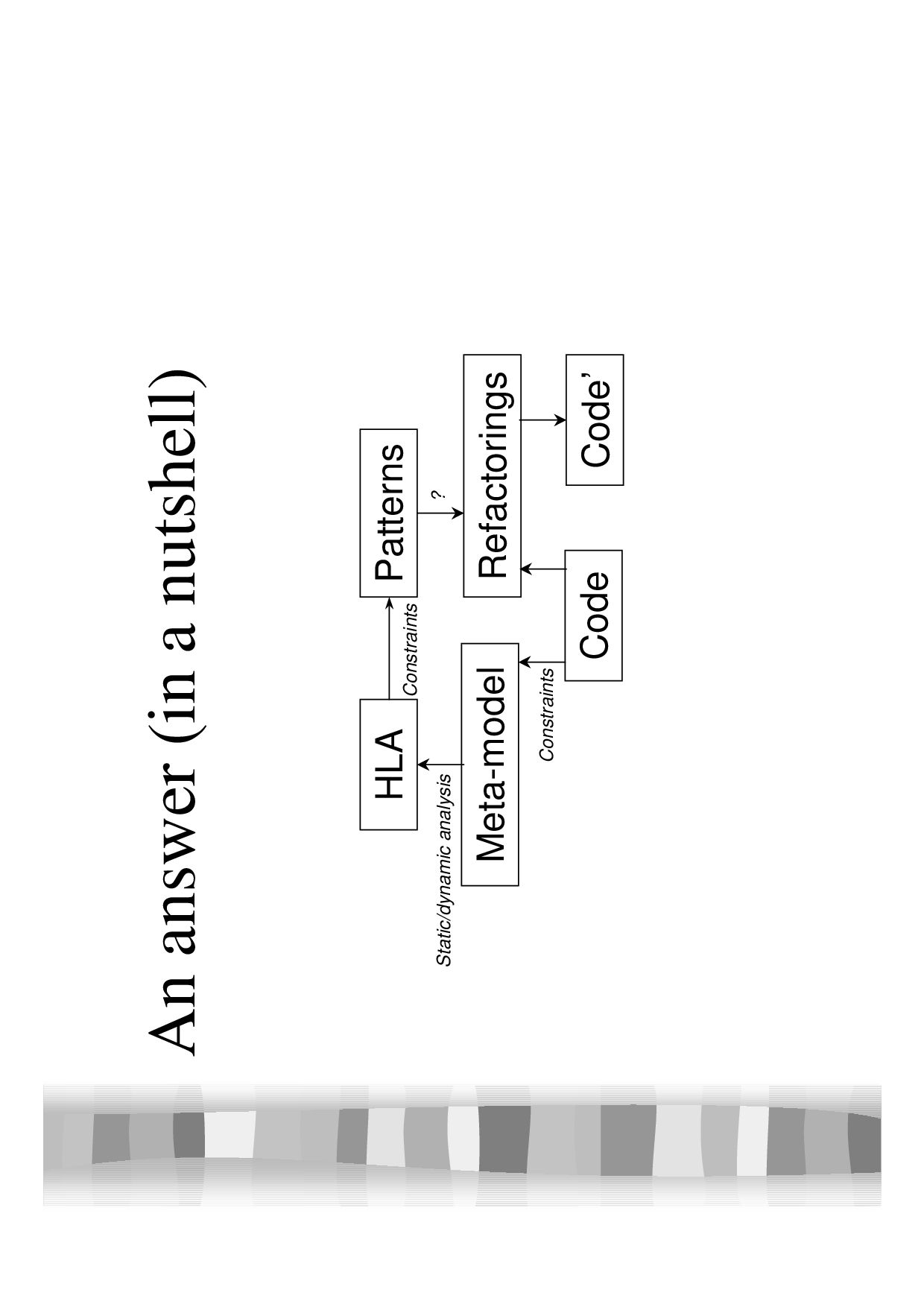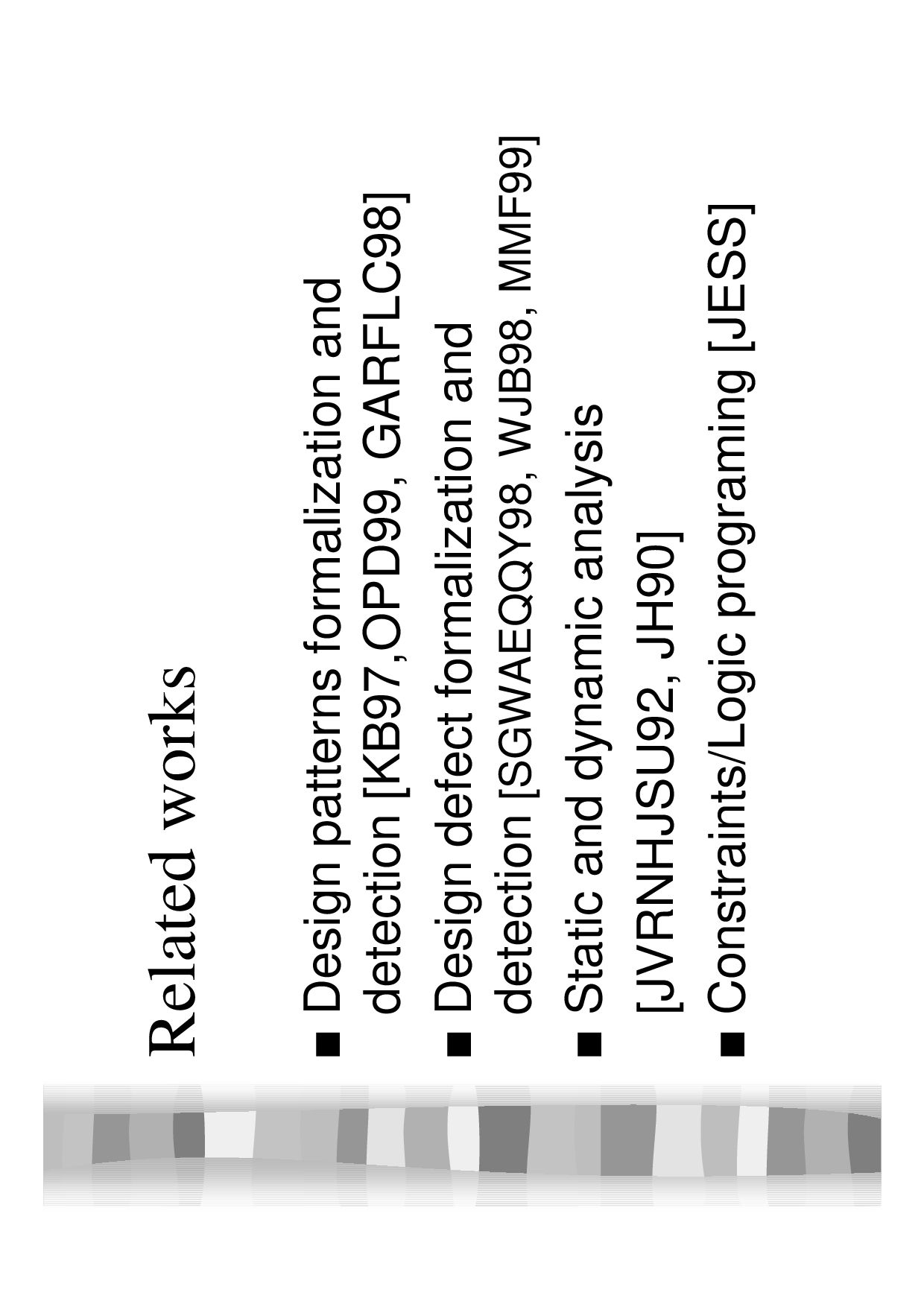 focuses on refactorings: – What refactorings are interesting? [MF99] – How to prove they don’t change the behaviour of the program? [WFO92, DBR99] – How to compose them? [MÓC00] – How to support them [DR97, JREFACTORY, IJRENAMER, XREFACTORY] I BUT...