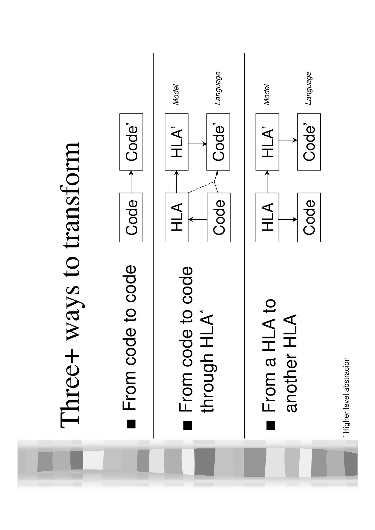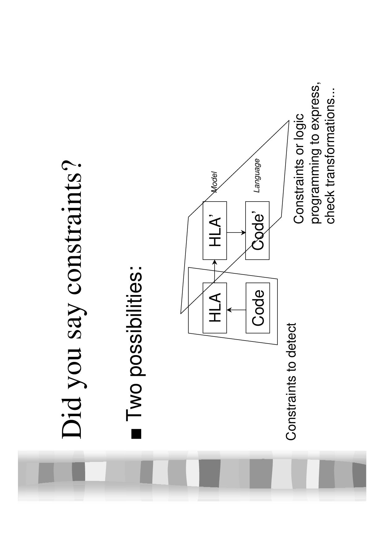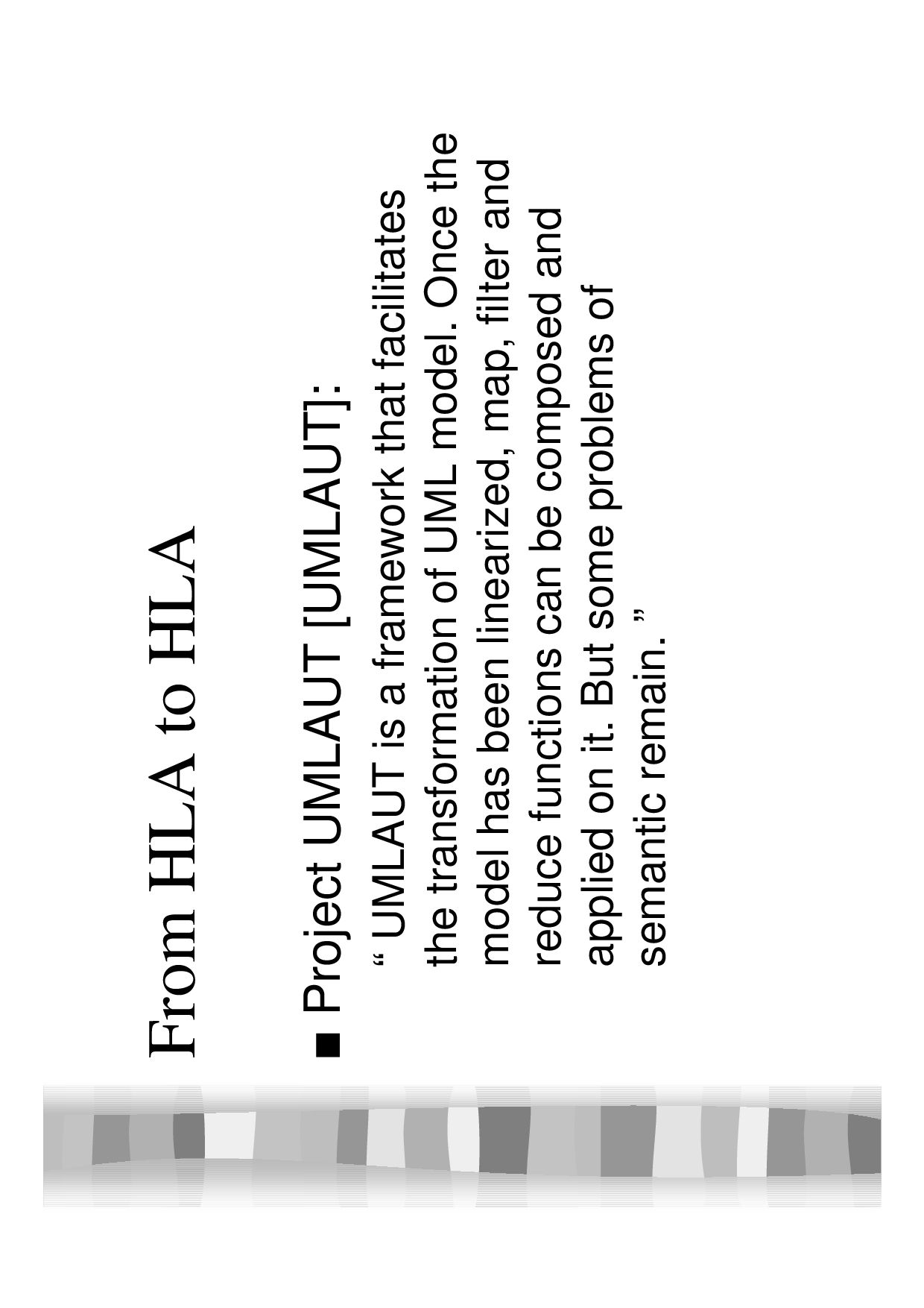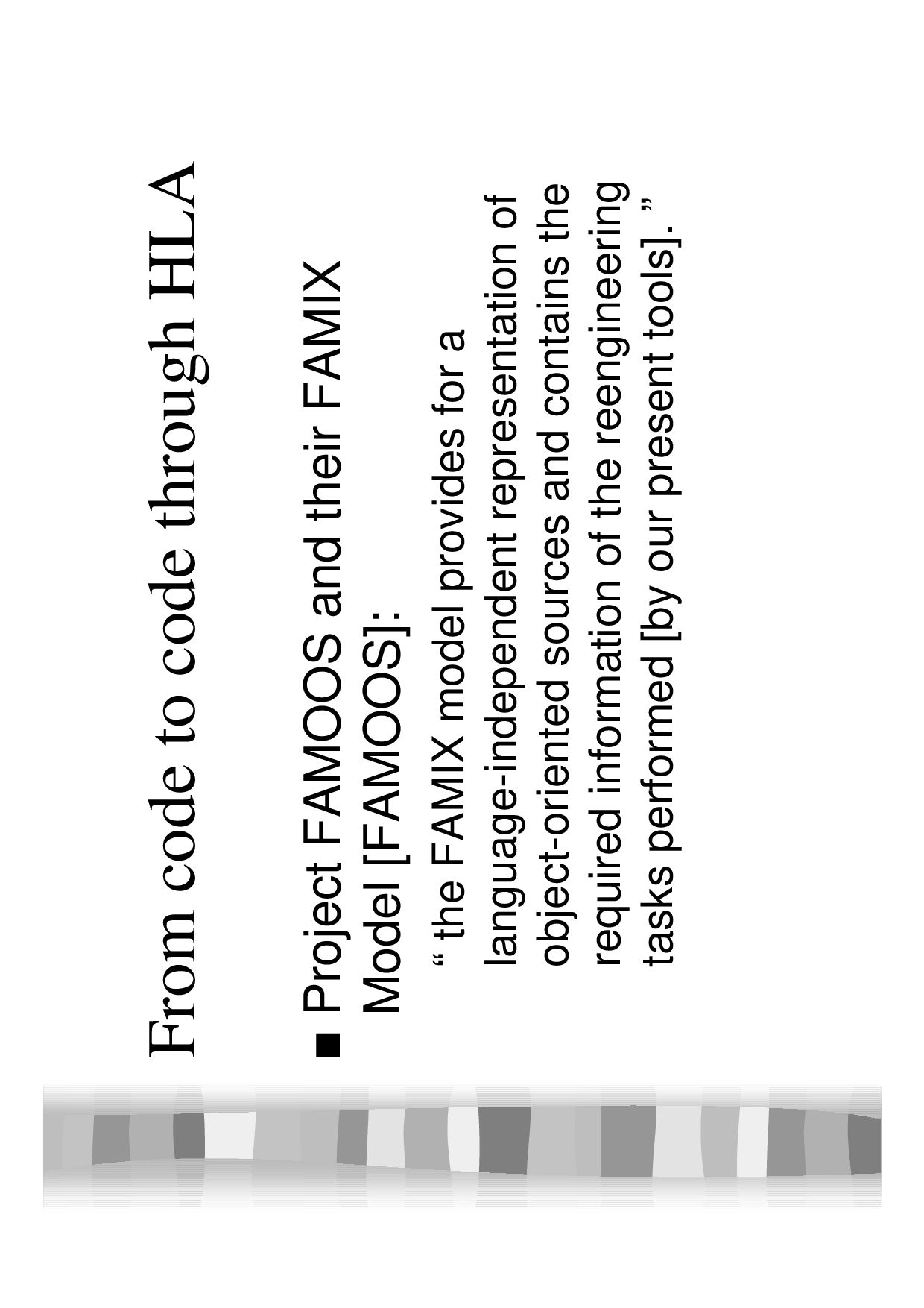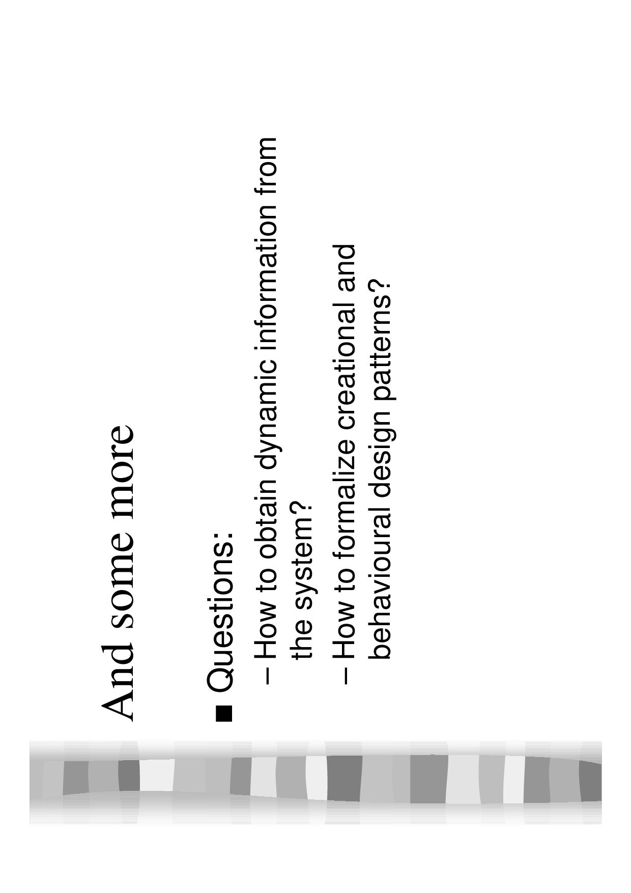 focuses on refactorings: – What refactorings are interesting? [MF99] – How to prove they don’t change the behaviour of the program? [WFO92, DBR99] – How to compose them? [MÓC00] – How to support them [DR97, JREFACTORY, IJRENAMER, XREFACTORY] I BUT...