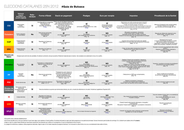 Privatització de la Sanitat CIU Sí Ciutadans No CUP Sí ERC Sí Desaprovació amb tots els candidats. Si obtenen suficients vots per accedir al Parlament abandonaran el càrrec i els ciutadans ens estalviarem el sou d'un polític. Iniciativa Sí PP No PSC Social-demòcrata Sí Sí Totes les decisions es prenen per democràcia directa, és a dir, a través de referèndums vinculats i Iniciatives Legislatives Populars (ILP) SI Independentista Sí UCE Sí No No he trobat informació al respecte # Els partits estan ordenats alfabèticament. # Els temes escollits són en els que realment hi pot haver algun canvi gràcies a l'acció política. He deixat de banda la major part dels programes on es parla de promeses i bones intencions però buides de contingut. Ex: Lluitarem per acabar amb el fracàs e scolar. # Alguns cops he copiat frases literals per transmetre exactament les paraules que utilitzen en el programa a fi que la interpretació la faci el lector. # La pàgina fa referència a cadascun dels programes electorals. Alguns cops no he trobat resposta al programa electoral i ho he buscat en altres fonts on es veu una declaració clara sobre el tema. ELECCIONS CATALANES 25N 2012 #Guia de Butxaca Definició segons Wikipedia.org (versió anglesa) Refe- rèndum Nacionalista, Cristià, Centre-dreta Interdependència compartida amb Espanya i CE (roda de premsa Artur Mas 15/10/2012) Enllaç Farem una Llei de Segona Oportunitat per trobar sortida als casos de sobre endeutament familiar sempre que el deutor sigui de bona fe, és a dir, per causes sobrevingudes i es tracti de l’habitatge habitual (pàg. 88) SÍ als peatges (entrevista Salvados part 6 min. 3.58) Enllaç SÍ A l'euro per recepta (entrevista Salvados Part 6 min. 4,22 ) Enllaç - “Mantindrem els nivells actuals de pressió tributària .” - “Defensarem la reducció de l'IVA sobre la cultura, la salut, els serveis socials i el turisme.” - “Convergència i Unió es mostra favorable a la introducció d’una taxa que gravi les transaccions fnanceres, sota determinades condicions i sempre que es faci de manera conjunta a tot el territori de la UE.” (pàg. 28 i 29) Mesures d'integració entre sanitat pública i privada i creació d'un codi ètic per a la seva convivència (pàg. 86 i 87) Centre-esquerra, no-nacionalista Estat de les autonomies amb limitació de competències (pàg. 6) SÍ a la dació en pagament (pàg. 23) SÍ Als peatges, però renegociant les condicions. (Pàg. 13) NO A l'euro per recepta (pàg. 12) - Recuperar successions i donacions - Crear impost sobre l'energia nuclear - Supressió de les taxes per accés a la justícia - Creació d'una taxa sobre les concessionàries de peatges (pàg. 12) Mesures per diferenciar clarament entre Sector públic, concertat i privat (pàg. 17) Independentista D'esquerres Assembleari República de Catalunya (pàg. 3) SÍ a la dació en pagament (pàg. 19) NO als peatges Enllaç NO A l'euro per recepta Enllaç - Augment de la pressió fiscal sobre els capitals - Implantació d'una taxa sobre les transaccions financeres (pàgs. 12 i 13) - Derogació de tot acord o concert amb entitats privades en l'àmbit dels serveis públics i les pensions. - Impulsarem l'assumpció per part del sector públic de les escoles i hospitals concertats” Independentista D'esquerres República de Catalunya (pàg. 111) SÍ A la dació en pagament (pàg. 96) SÍ Peatges tous (pàg. 100) NO a l'euro per recepta. (pàg. 43) - Crear una taxa sobre transaccions financeres - Reducció de l'impost sobre el consum (pàg. 14) “Aturarem el procés de privatització dels centres públics” - Reduirem el diners públics destinats a empreses privades (pàg. 43) Escons en blanc Eco-socialista, Catalanista Federalisme o independència, depenent de la voluntat del poble (pàg. 132) SÍ A la dació en pagament (pàg. 118) NO als peatges. Substituir els peatges per un Sistema de finançament per vehicle privat (pàg. 51) NO a l'euro per recepta. (pàg. 78) - Restituir l'impost de successions i donacions - Creació de taxa sobre transaccions financeres - Creació d'impost a la Banca - Reducció de l'IVA - Creació d'un impost a les grans fortunes - Nou tram d'IRPF per a les rendes de més de 300.000 euros - Crear impost sobre energia nuclear, emissió de CO2 i altres activitats contaminants (pàg. 13, 14 i 15) “Aturarem i revertirem el procés de privatització i precarització de la sanitat pública.” (pàg. 72) Unionista, Cristià, Centre-dreta Estat de les autonomies (pàg. 8) “Trabajaremos para mejorar la protección de los propietarios y la actual regulación de las deudas hipotecarias para la adquisición de la vivienda Habitual.” (pàg. 12) SÍ als peatges. Millora de les bonificacions (pàg. 11) NO a l'euro per recepta. (pàg. 17) - Deduccions a l'IRPF per a emprenedors. (pàg. 12) Nuevo modelo de concertación de servicios de atención a las personas (pàg. 84) Nació federal dins Espanya (pàgs. 5, 6 i 7) “Recolzarem la regulació real de la dació en pagament” (pàg. 105) SÍ als peatges. Reducció de preus i peatge tou (pàg. 101) NO a l'euro per recepta. (pàg. 59) - Restituir successions i donacions - Increment de l'impost sobre el Patrimoni - Impost sobre els beneficis de les entitats financeres Accés universal al sistema de salut (pàg. 56) Pirates de Catalunya Democràcia directa, reforma de la propietat intel·lectual I lliure accés a la informació. República de Catalunya (entrevista La Vanguardia 16/11/2012) SÍ a la dació en pagament (pàg. 52) NO als peatges (pàg. 53 i 54) NO (declaracions López Tena 15/11/2012) Enllaç - Nou impost de successions i donacions - Fiscalitat ecològica Tots els ciutadans tindran dret a una assistència sanitària. Cap ciutadà serà desatès per causes econòmiques. (pàg. 48) Marxista-Leninista, Maoísta No he trobat informació al respecte. SÍ a la dació en pagament (pàg. 5) NO (Blog UCE Terrassa) Enllaç NO A l'euro per recepta. (pàg.