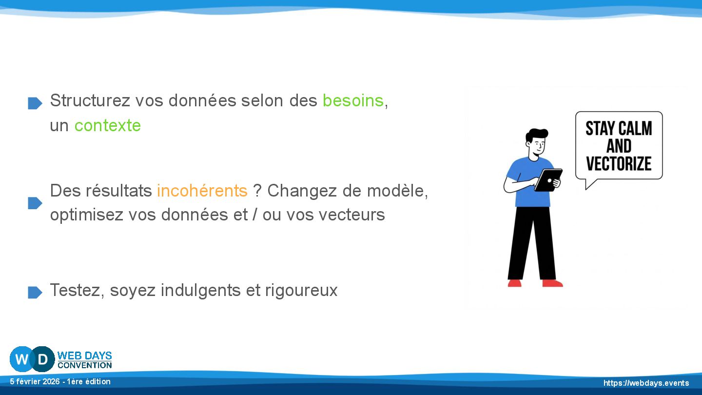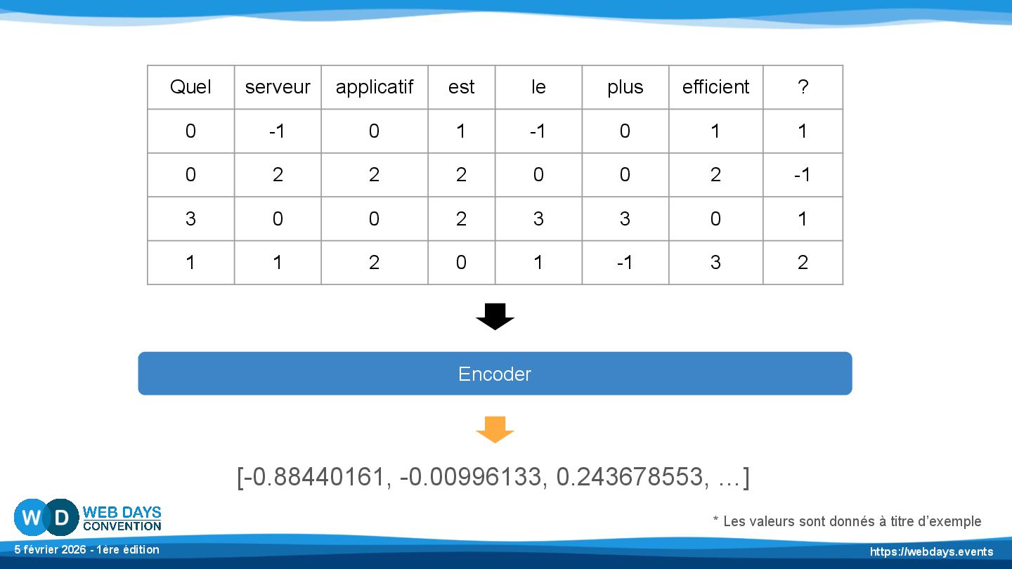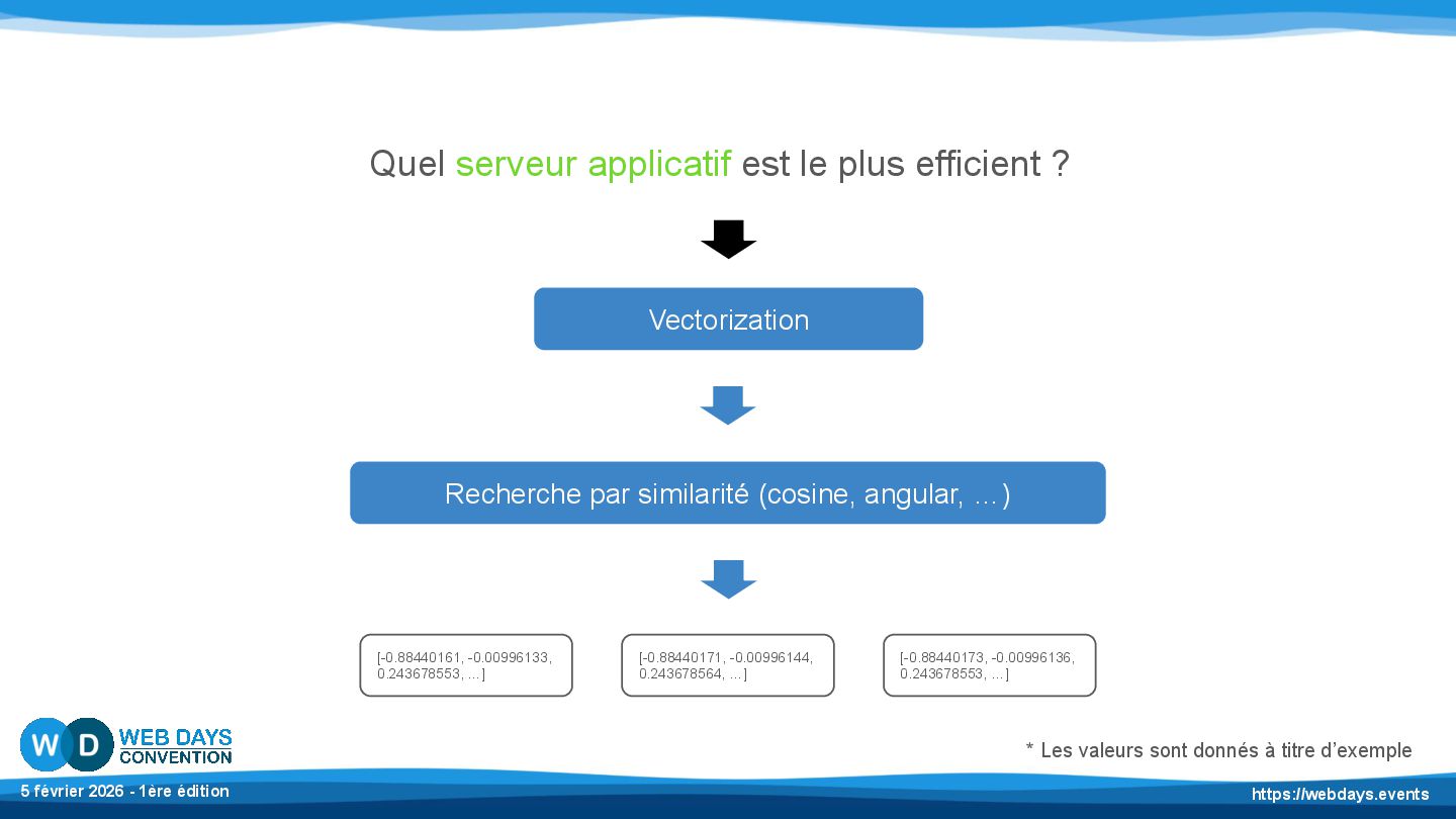 est le plus efficient ? * Les valeurs sont donnés à titre d’exemple Recherche par similarité (cosine, angular, …) Vectorization [-0.88440161, -0.00996133, 0.243678553, …] [-0.88440171, -0.00996144, 0.243678564, …] [-0.88440173, -0.00996136, 0.243678553, …]