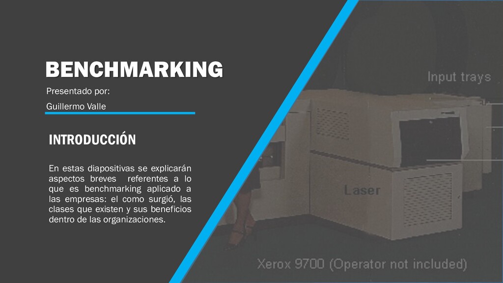 a lo que es benchmarking aplicado a las empresas: el como surgió, las clases que existen y sus beneficios dentro de las organizaciones. Presentado por: Guillermo Valle