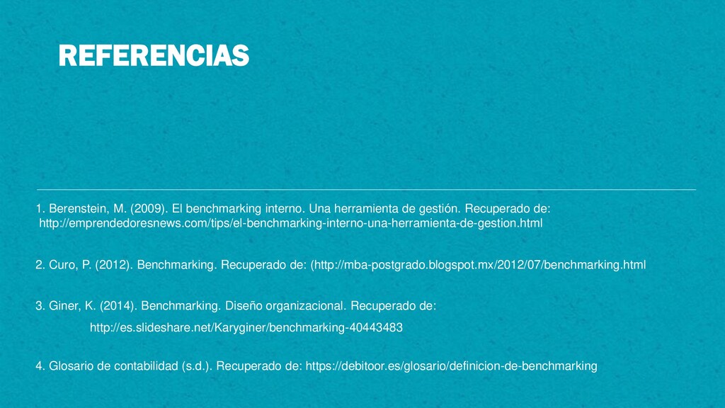 Glosario de contabilidad (s.d.). Recuperado de: https://debitoor.es/glosario/definicion-de-benchmarking 3. Giner, K. (2014). Benchmarking. Diseño organizacional. Recuperado de: http://es.slideshare.net/Karyginer/benchmarking-40443483 1. Berenstein, M. (2009). El benchmarking interno. Una herramienta de gestión. Recuperado de: http://emprendedoresnews.com/tips/el-benchmarking-interno-una-herramienta-de-gestion.html
