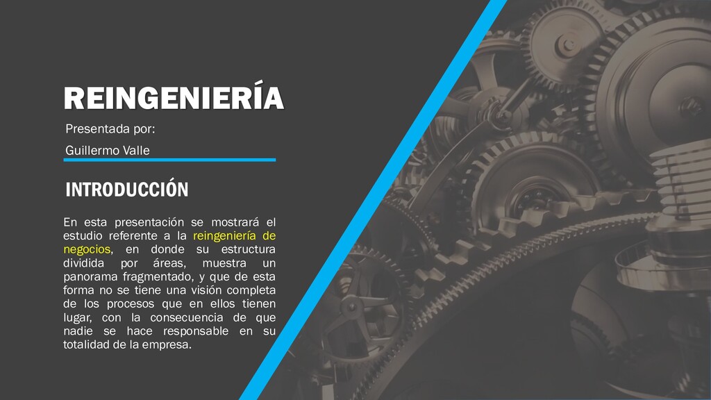 el estudio referente a la reingeniería de negocios, en donde su estructura dividida por áreas, muestra un panorama fragmentado, y que de esta forma no se tiene una visión completa de los procesos que en ellos tienen lugar, con la consecuencia de que nadie se hace responsable en su totalidad de la empresa. REINGENIERÍA