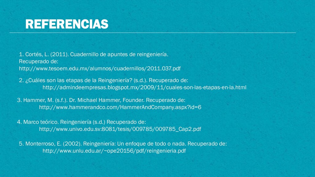 de: http://www.hammerandco.com/HammerAndCompany.aspx?id=6 5. Monterroso, E. (2002). Reingeniería: Un enfoque de todo o nada. Recuperado de: http://www.unlu.edu.ar/~ope20156/pdf/reingenieria.pdf 1. Cortés, L. (2011). Cuadernillo de apuntes de reingeniería. Recuperado de: http://www.tesoem.edu.mx/alumnos/cuadernillos/2011.037.pdf 4. Marco teórico. Reingeniería (s.d.) Recuperado de: http://www.univo.edu.sv:8081/tesis/009785/009785_Cap2.pdf 2. ¿Cuáles son las etapas de la Reingeniería? (s.d.). Recuperado de: http://admindeempresas.blogspot.mx/2009/11/cuales-son-las-etapas-en-la.html