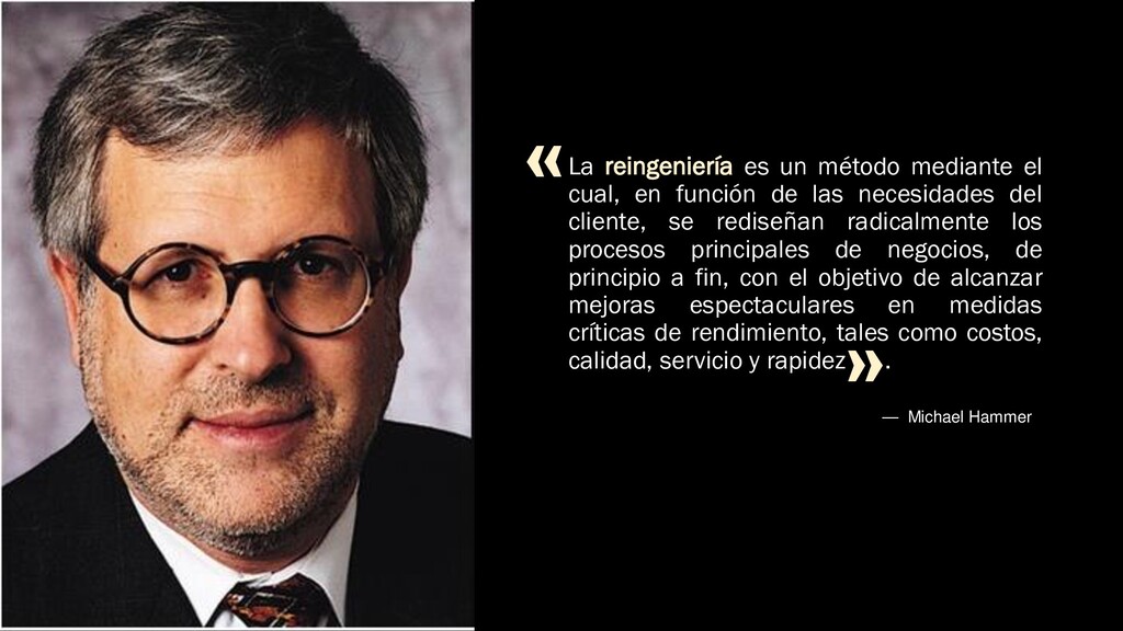 de las necesidades del cliente, se rediseñan radicalmente los procesos principales de negocios, de principio a fin, con el objetivo de alcanzar mejoras espectaculares en medidas críticas de rendimiento, tales como costos, calidad, servicio y rapidez . « » — Michael Hammer