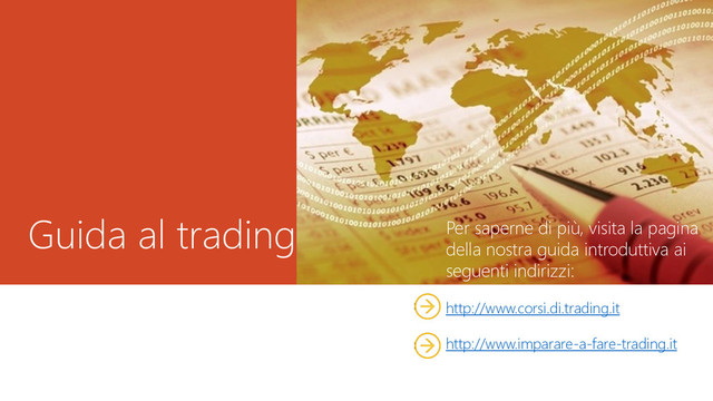mercato piu' entusiasmante e dinamico al mondo. Con i suoi 4 trilioni di dollari negoziati ogni giorno, e' anche il mercato finanziario piu' grande al mondo. Forex (o FX) sta per "foreign exchange", ovvero scambio di valuta estera. Il mercato forex online e' al 90% speculativo: cio' significa che l'operatore non prende possesso della valuta effettiva, in forma fisica, ma apre e chiude contrattazioni realizzando un profitto o una perdita poi contabilizzato sul conto online. Il mercato forex e' un mercato over the counter (o OTC): cio' significa che il trading avviene direttamente tra due parti senza passare attraverso una borsa valori. In questo modo e' possibile accedere comodamente al mercato virtuale online ovunque nel mondo.